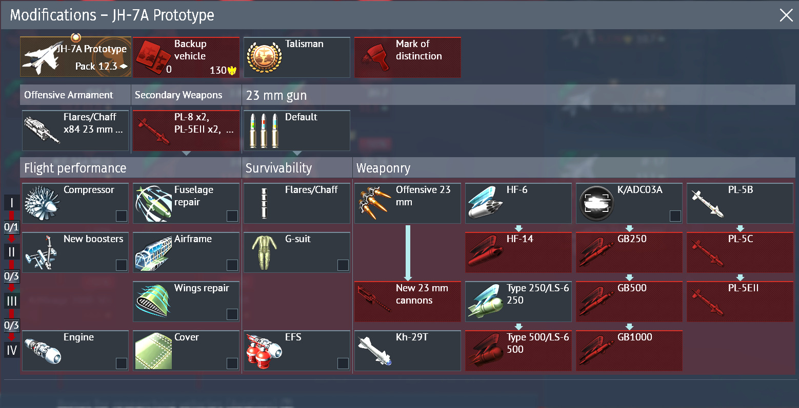 The premium JH-7A Prototype is a top-rank aircraft. It takes the unguided arsenal of the JH-7 and supplements it with guided weapons, for engaging both ground and air targets. One of the JH-7A Prototype’s most dangerous weapons is the Kh-29T guided missile with a thermal imaging targeting pod, allowing it to engage ground targets from significant distances in all weather conditions. The JH-7A Prototype also has several types of guided bombs, including the advanced GB250 with a combination of laser and satellite guidance and an inertial correction system. For Air Battles, it has a radar warning receiver, a large number of high caliber chaff and flares, a 23 mm cannon and most importantly, guided short-range missiles, including the fast and agile all-aspect PL-8 and up to four PL-5EII missiles.