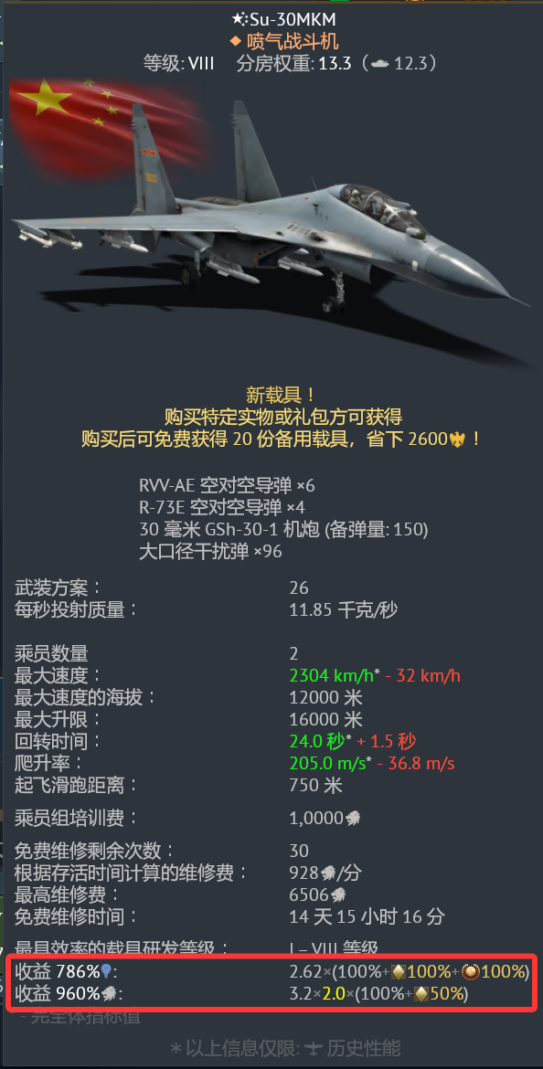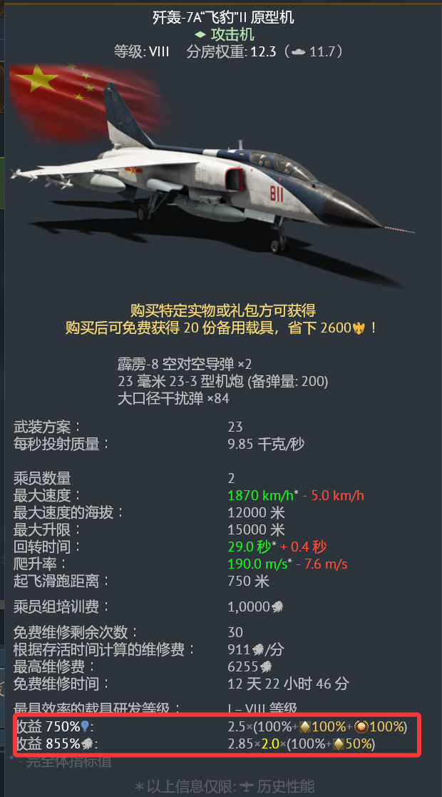 研发点系数可能是跟着权重走的,因为几个大黄蜂礼包机(CF-188a、瑞士和美国 F/A-18)以及更早的 F-20A 的基础研发点系数同样是 2.5,相比之下位于 13.0 和 13.3 的 JA37DI 以及 JF-17 基础研发系数就是 2.56