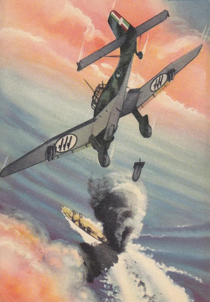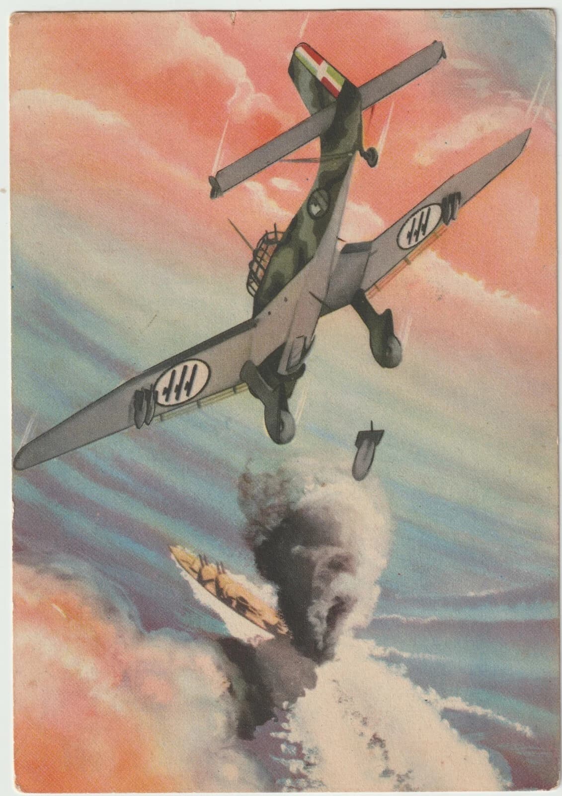 The Junkers Ju 87 “Stuka” is a German dive bomber and ground attack aircraft that debuted in 1937 in Spain in the ranks of the Luftwaffe. Italy, an ally of the Stuka’s German progenitor, took an interest, albeit a modest one, in the aircraft and in 1940 received a few examples (less than a hundred) that equipped a number of flight groups and carried out various wartime missions in the Mediterranean, North Africa and the Greek-Balkan area. Naturally, these aircraft were taken up by Italian draughtsmen and illustrators, who portrayed them in propaganda images for Italian postcards and posters, and one in particular was drawn in a war action against a presumably British battleship in the middle of the sea.