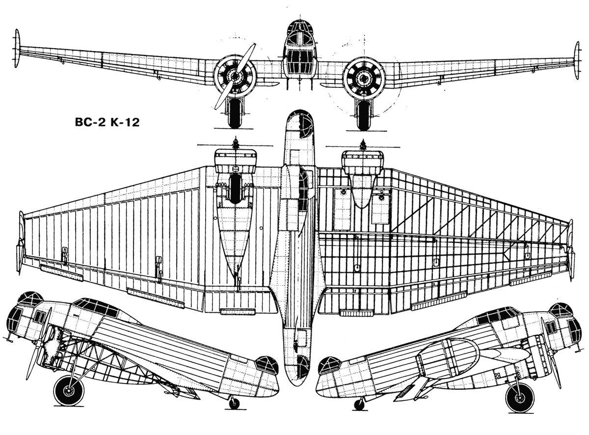 Konstantin Kalinin’s submission to the VS-2 (troop aircraft) design in 1933, the K-12 was a highly radical tailless plane design, with configurations for a transport, air ambulance, and bomber. There were 2 other proposals, but Kalinin himself preferred the tailless one. A half-scale glider was built in 1934, which logged over 100 flights. A bomber prototype was then constructed at GAZ No.18 in Voronezh, designated the K-12. It was intended to fit M-25 engines, but lack of availability meant they had to settle with M-22 engines, which required them to decrease weight by making the landing gear fixed. The aircraft was fitted with 2 turrets and a KD-2 bomb rack capable of fitting 8 bombs. The bombardier also has access to a control stick in case the pilot is incapacitated. After factory tests it was sent to Moscow for official evaluation, however, tests there found major control issues and concluded that the design was underpowered and inefficient though promising. It was also refused official trials after.