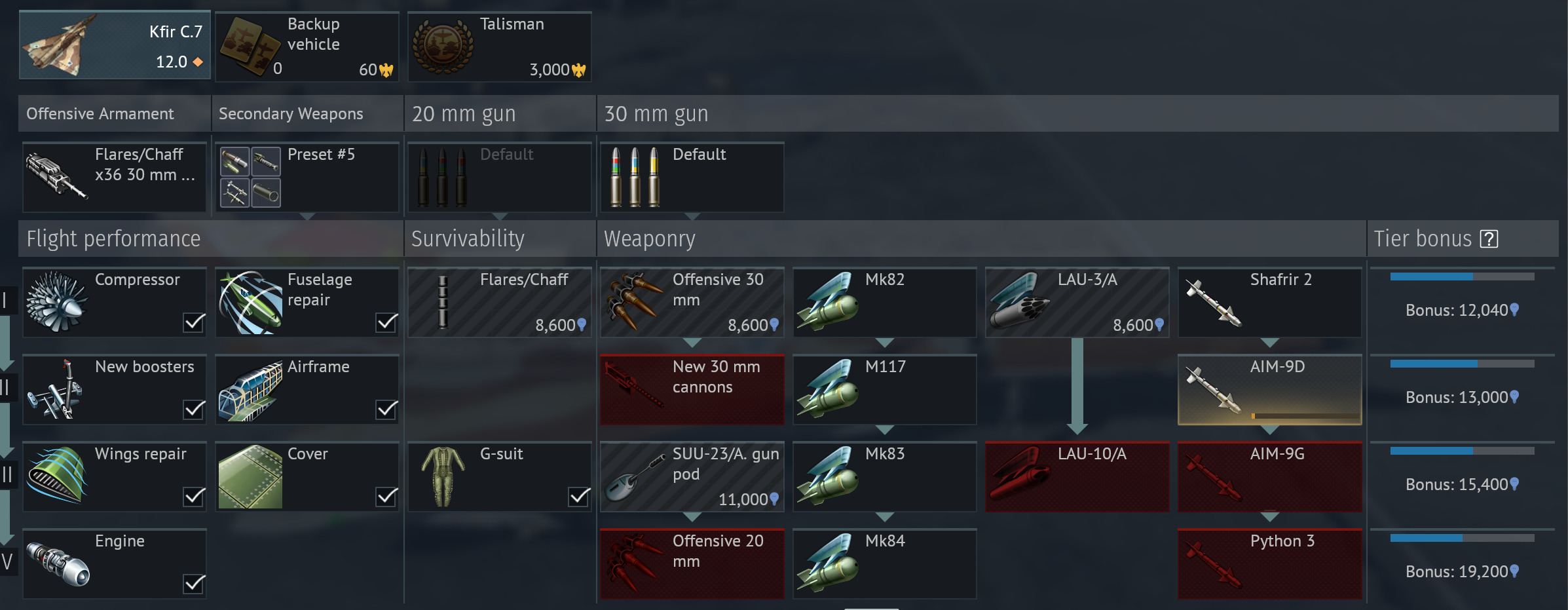 Kfir C7 is one of the best fighters at 12.0. Python 3s and good airframe performance with that powerful engine.