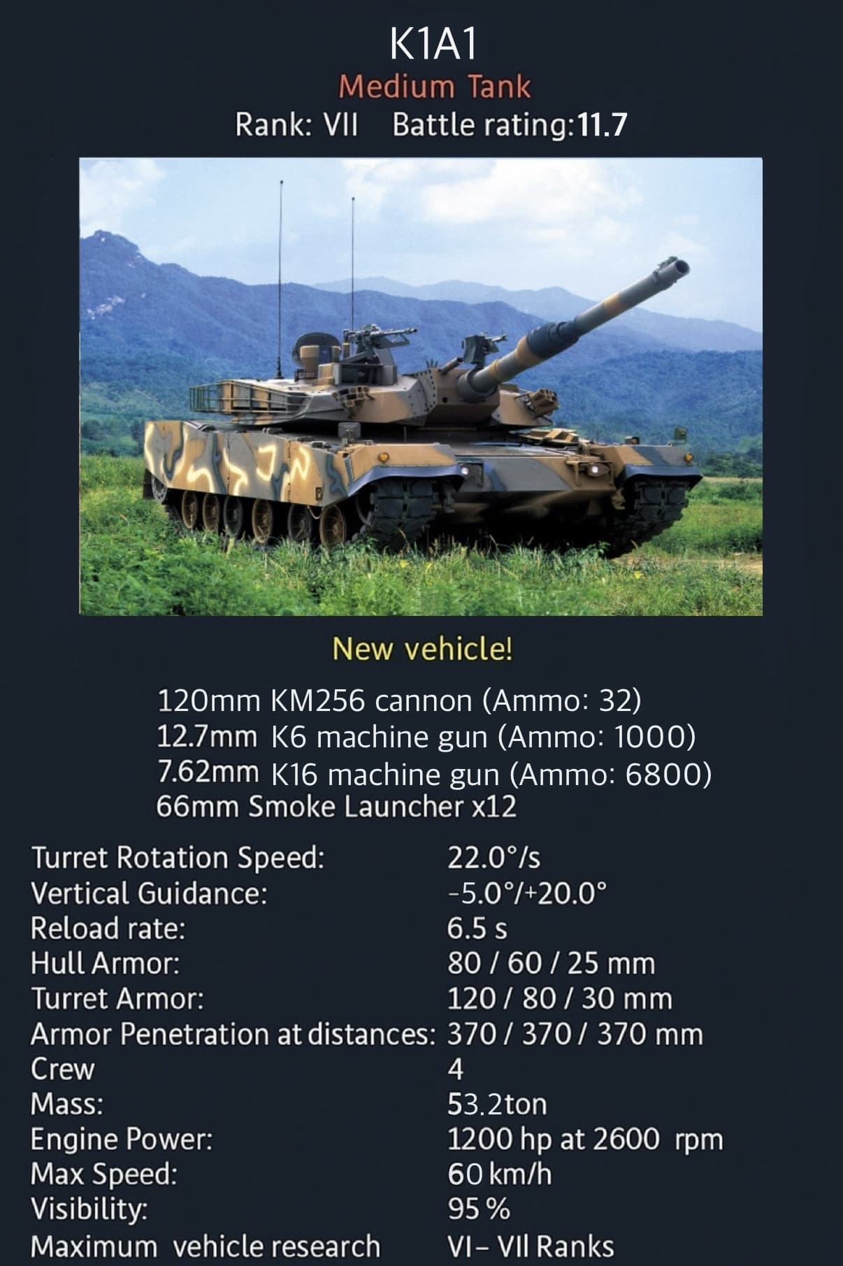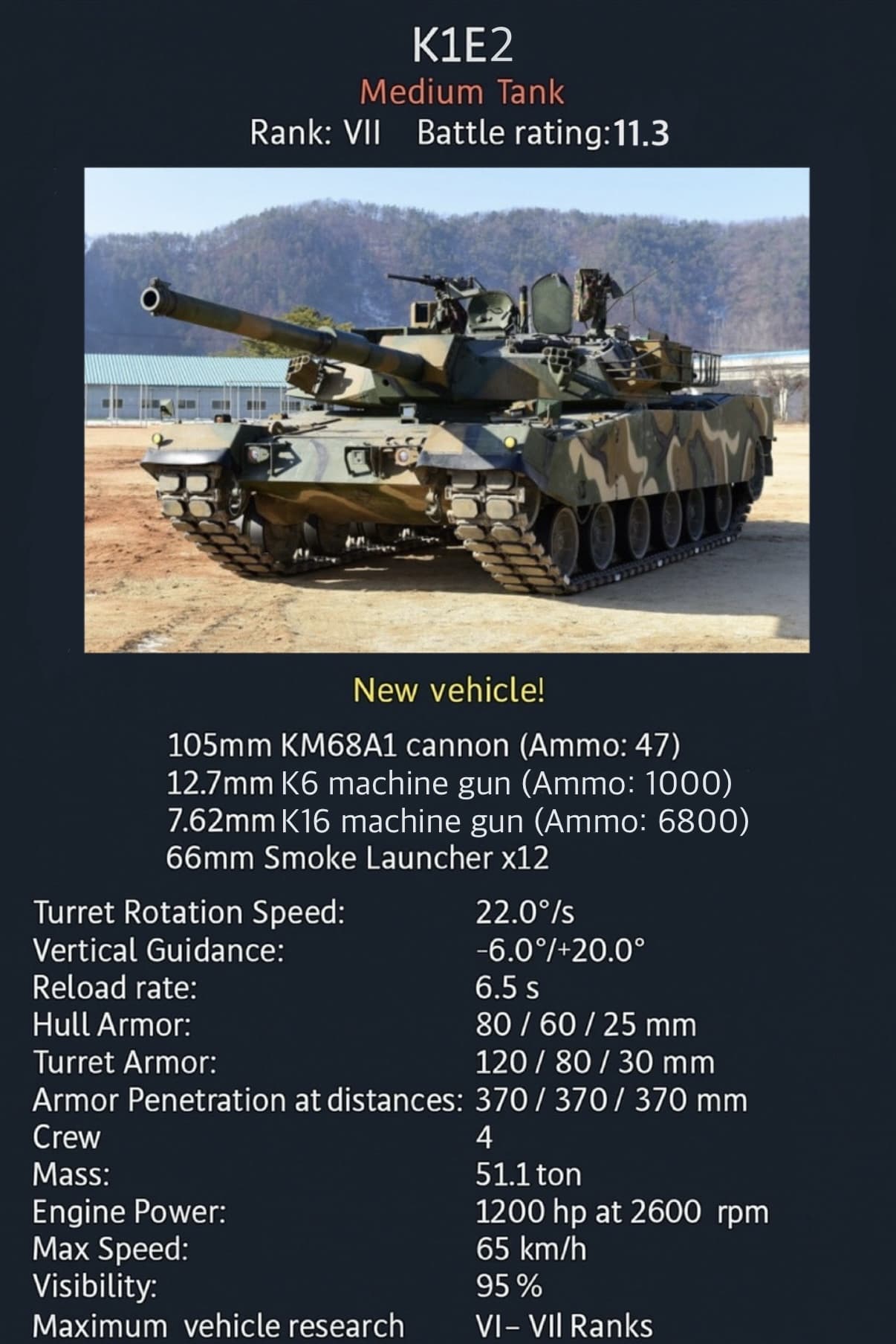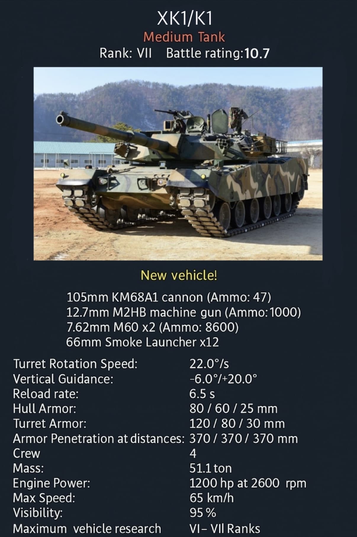 The tank developed under this program, designated XK-1 (later K-1), was based on the M1 Abrams but designed smaller and lighter to suit the Korean terrain. It featured a 105mm rifled gun, a modern fire control system, and a license-produced MTU diesel engine from Germany.