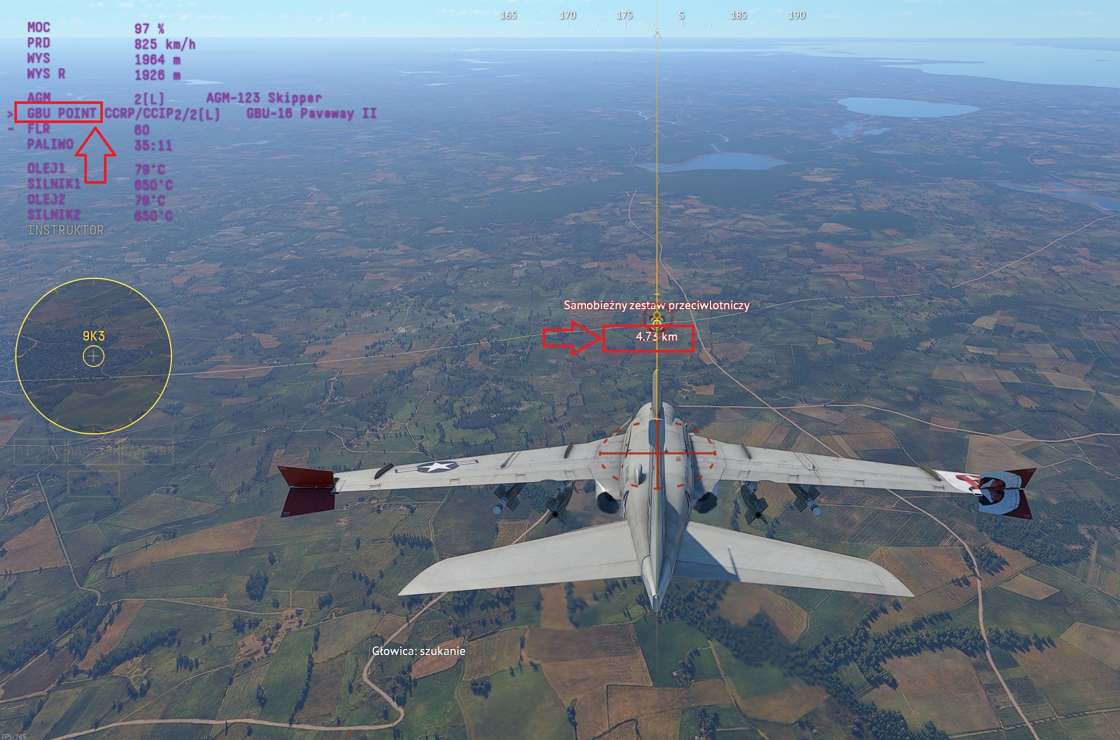 The point is that the POINT cue does not appear for the selected missile or bomb at distances greater than 5 km from the target. As a result, the dropped bomb or Skipper does not even start guiding toward the target.