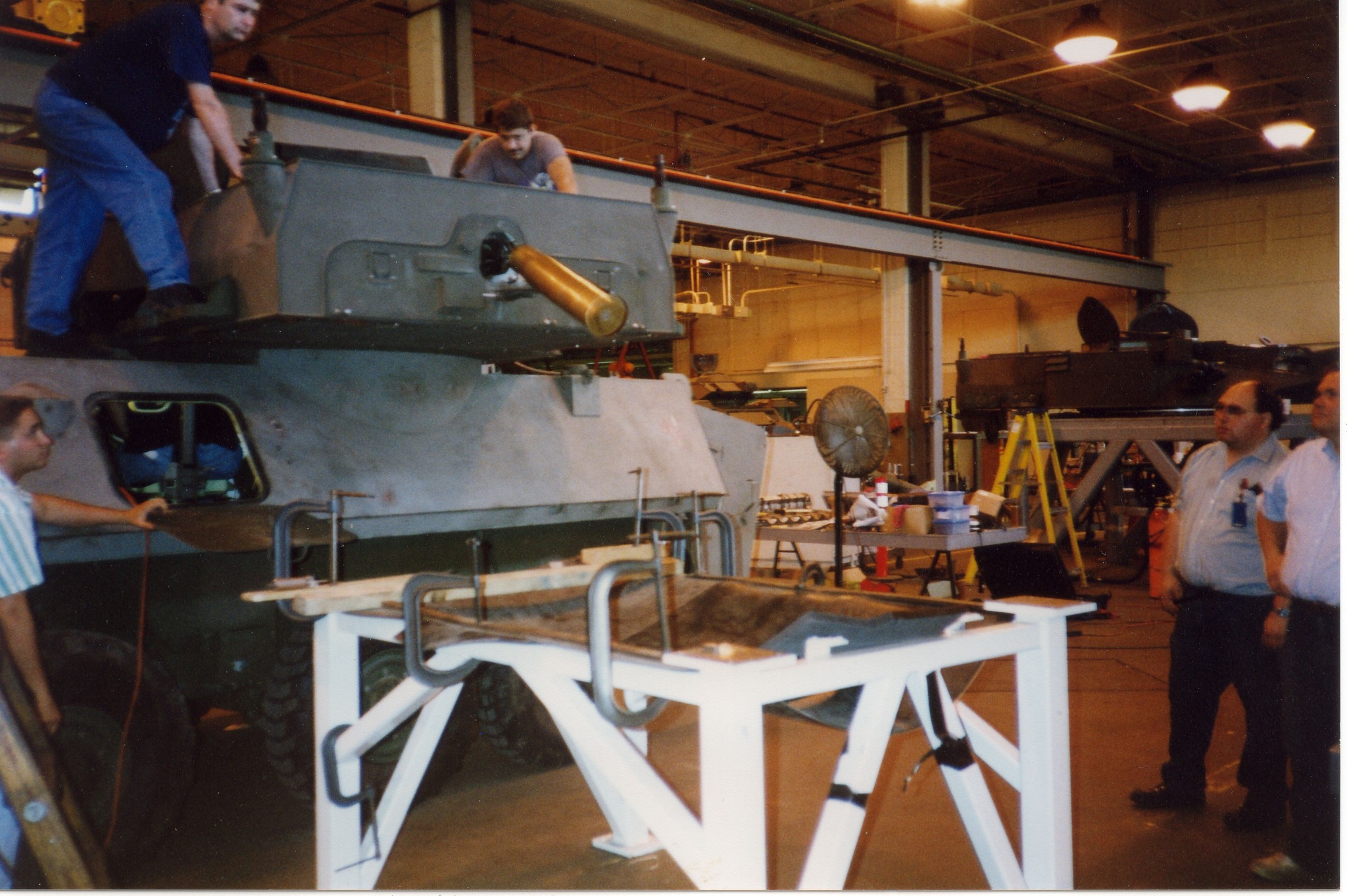 In 1990, General Motors presented a solution to the recoil issue, by installing in the LAV-25 what was essentially a downsized Stingray light tank turret. Armed with Watervliet Arsenal’s Benet Laboratories XM35 105 mm low-recoil gun, the vehicle could handle the gun’s recoil, unlike previous attempts. The gun was fully stabilized and loaded by a Fairey Hydraulics Limited autoloader in the turret bustle, which could carry 8 ready rounds, reducing the crew in the turret to two. The gun and turret were traversed electrically by an HR Textron electromechanical gun/drive system, which solved an issue with burning hydraulic fluid found in previous American vehicles. The gun could fire standard NATO 105 mm ammunition, including American ammunition, ranging from the M456 HEAT round to the powerful M900 APFSDS-T round. The weight was increased to 16 tons, but this wasn’t seen as a major issue.