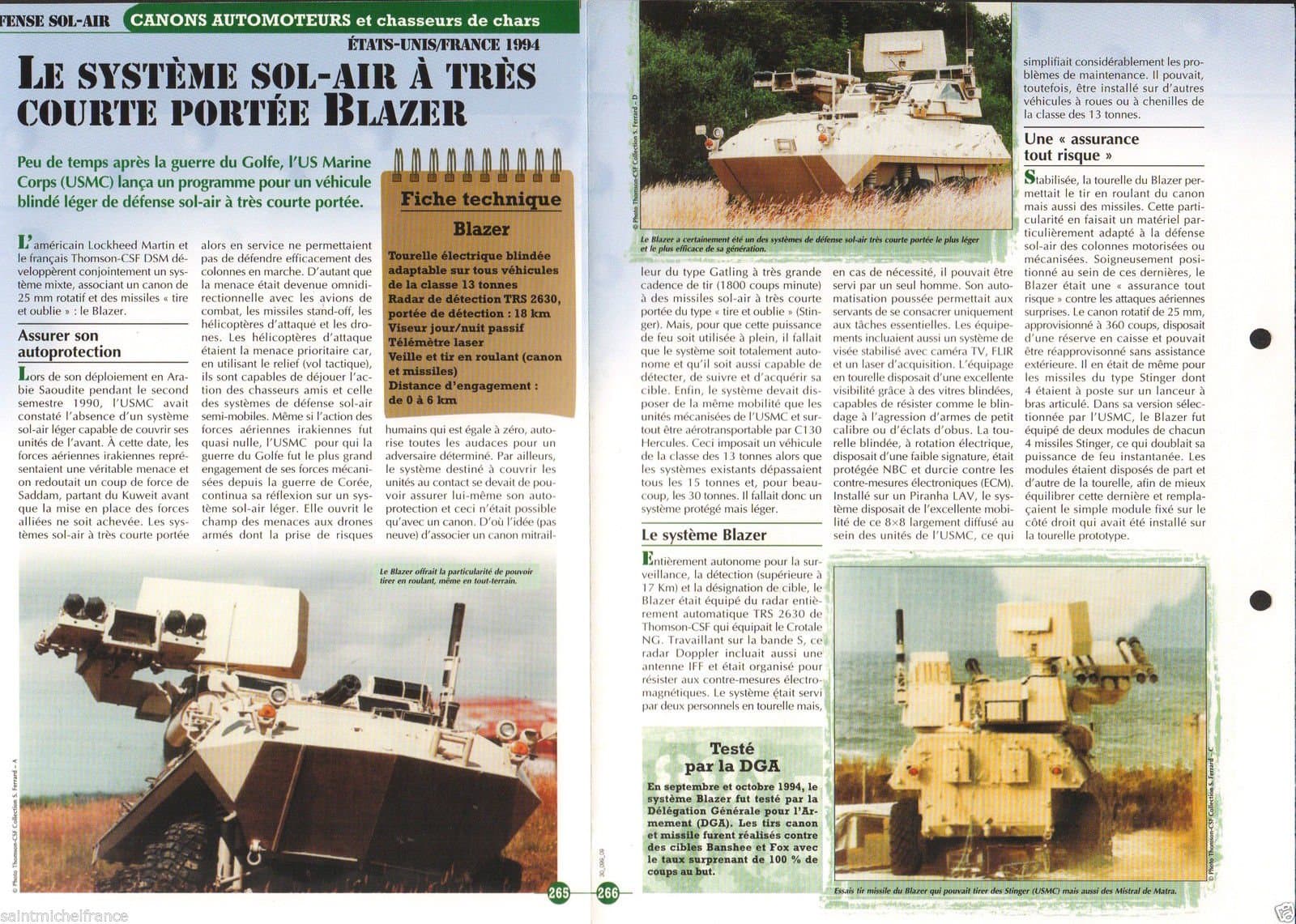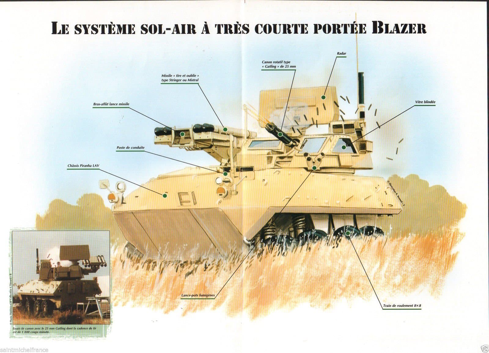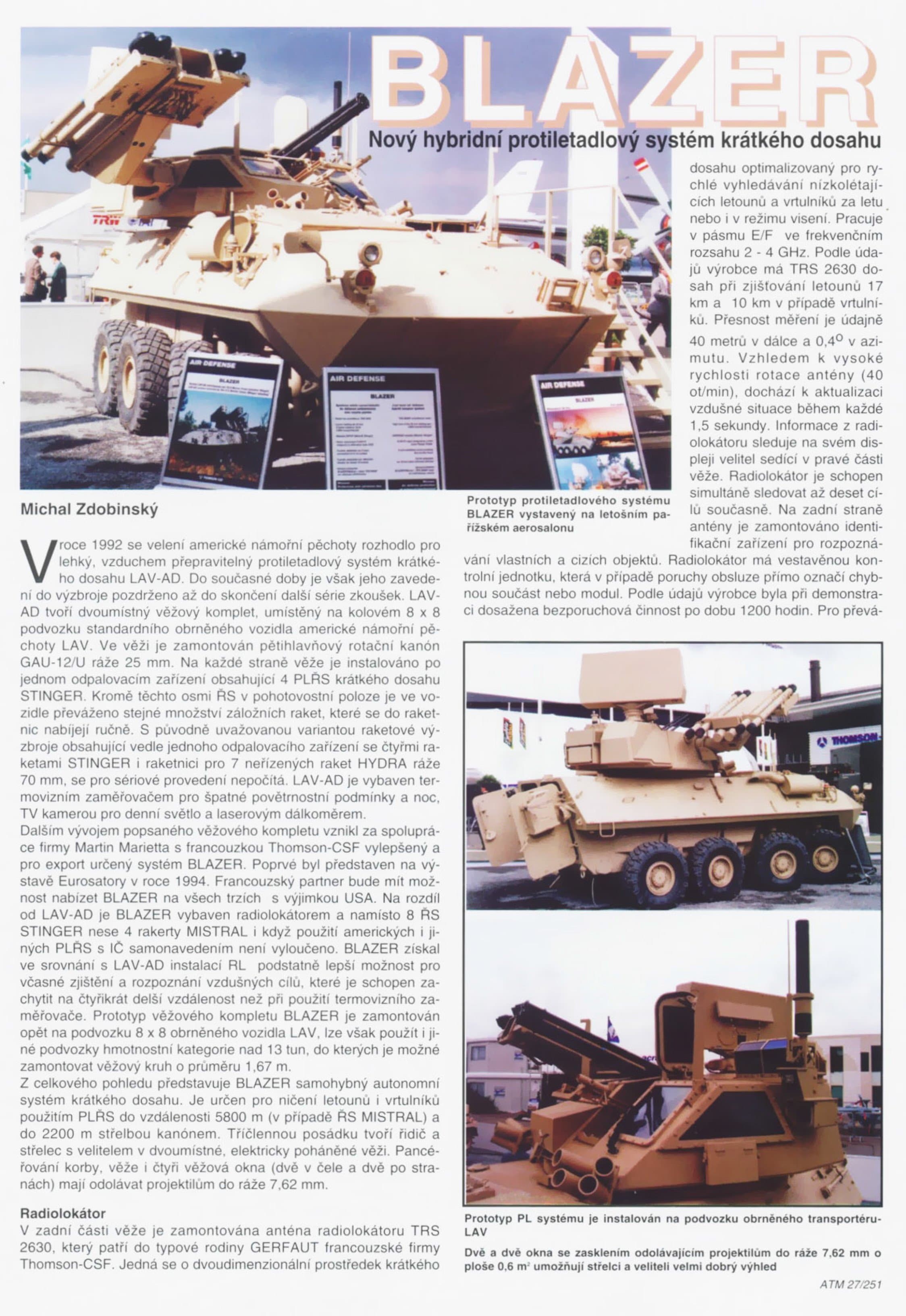 LAV-AD is a self-propelled air defense vehicle developed by General Dynamics Weapon Systems in the United States. The Blazer air defense system is an improved variant of LAV-AD, developed by General Dynamics Weapon Systems and Thales Air Defense for export markets. Unlike the original vehicle, the stinger launcher on the top of the turret has been replaced with a Thales TRS 2630P search radar, which can detect fixed wing targets up to a maximum distance of 17km and helicopter targets up to 8km. It also have IFF,automatic track-while-scan and data exchange for netting capability.The prototype vehicle was demonstrated in France in June 1994 and underwent live fire testing thereafter.