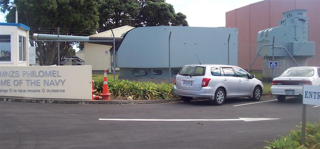 When she left Indian service in 1968 to be scrapped, Y turret and a fire director were removed and gifted to the New Zealand Government, where they sit to this day outside the entrance to the Devonport Naval base in Auckland, with the Ships bell on loan to the Auckland War Museum.