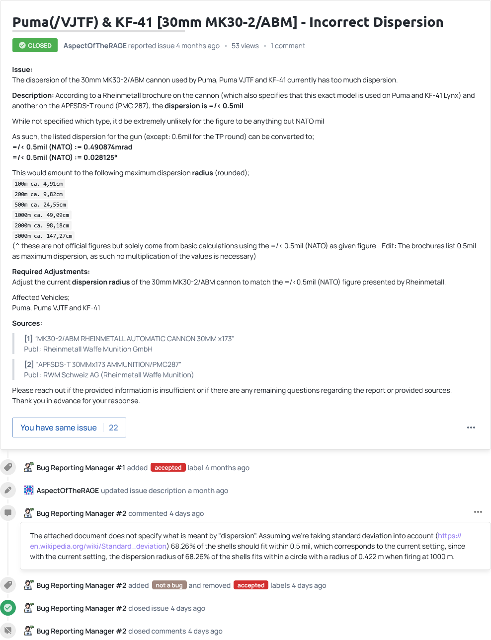 Rheinmetall quite literally says that the guaranteed accuracy is 0.6mrad (i.e. max. dispersion <= 0.6mrad, which corresponds to the 0.6mil figure presented for the TP-T round, which has the highest max dispersion out of all available rounds) and that the typical dispersion is 0.2mrad ± 1 sigma - which directly contradicts the theory of the bug-reporting manager that the typical dispersion (1 sigma) is 0.5mil.
