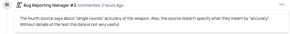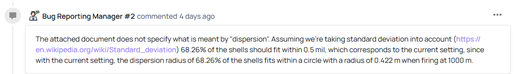 This is more than sufficient to disprove the response that I received on the initial report, where the bug-reporting manager assumed (rules for thee but not for me aah moment) that the “<= 0.5mil” figure could be typical dispersion (based on quite literally nothing btw) - as it directly and with 0 room for interpretation, says the typical dispersion is 0.2mrad (at the same ±1 sigma figure the bug-reporting manager referred to).