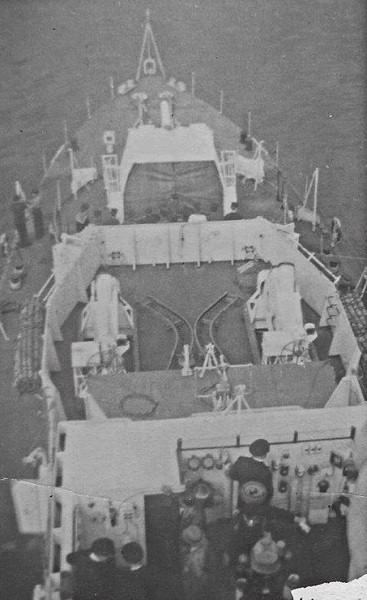 Bridge and Fo’c’sle on HMCS Loch Achanalt, 4-inch gun and Squid mortars are visible