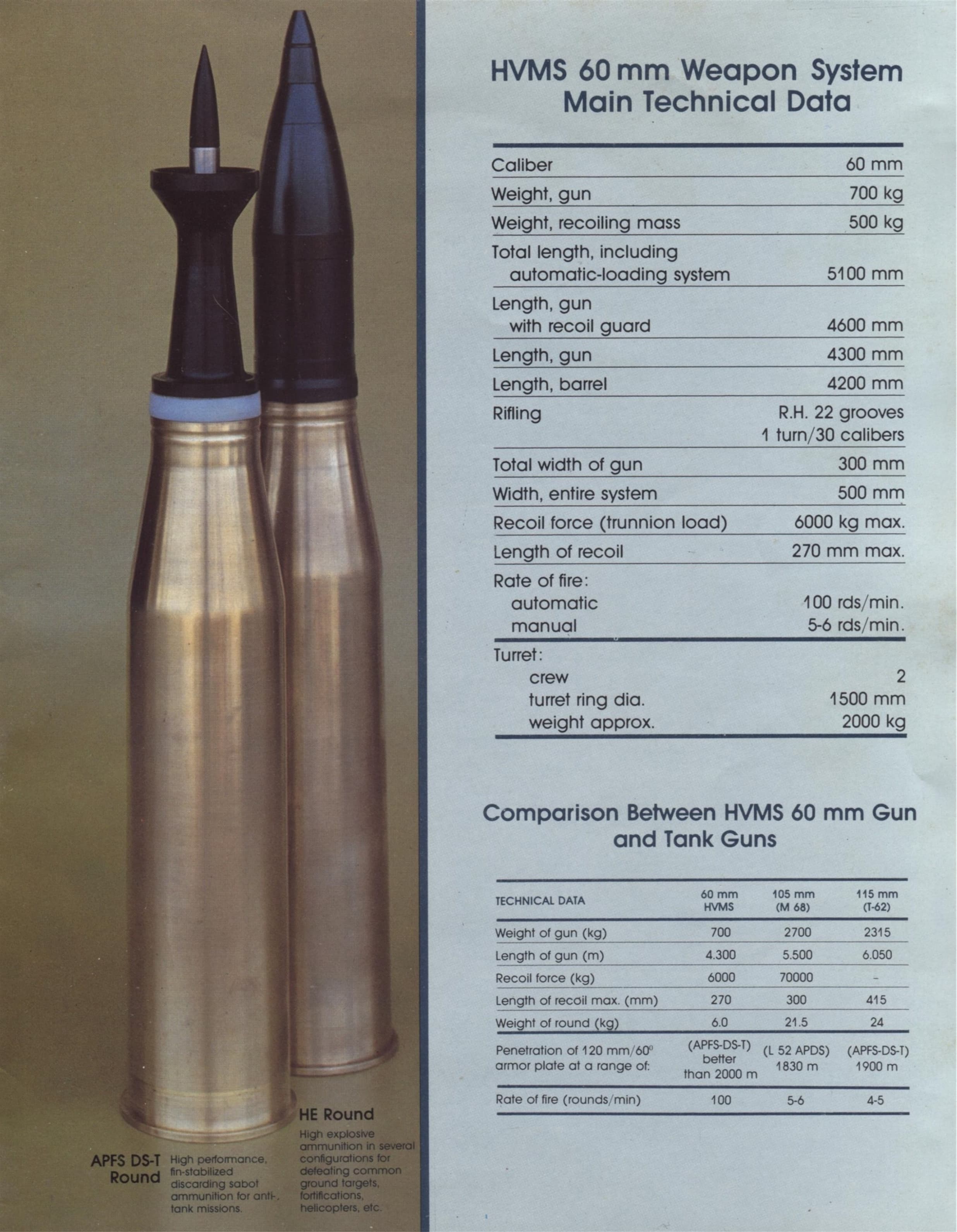 - Primary: 60 mm IMI HVMS (Hyper Velocity Medium Support) Gun, 12 shots per minute