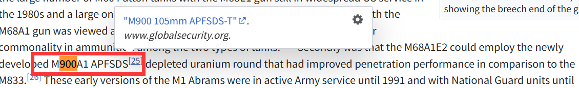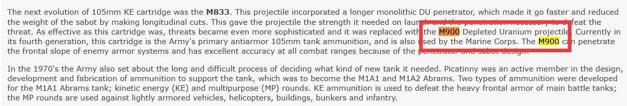 Moreover,we don’t know exactly what the differences between the M900A1 and the M900 are. Hell, sometimes both shells are in fact considered as one or there were rumours circulating online that the M900A1 in reality was a lower-pressure version of the M900 that was hastily put up for the USMC M60A1s and M60A3s to be used in the First Gulf War since the US Army had either the 105mm M1 and M1IP with their M833 and M900 or the M1A1 with the M829 which were all more efficient APFSDS rounds than the M774 which was used by the Pattons.