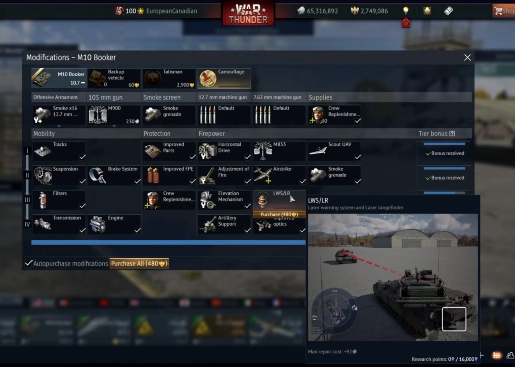 Despite having a strong start to its life, the M10 Booker fell out of favor with the U.S. Army and was canceled earlier this year, despite the army receiving 26 units. It features the XM35 105 mm gun, which is familiar to the American ground forces tree through the XM8 light tank. The M10 Booker lacks an autoloader, but in addition to the HEAT and excellent stock M833 APFSDS round, the available ammunition includes the M900 APFSDS shell with over 500 mm of penetration! In combat the Booker will be able to penetrate even the strongest MBTs in the usual weak areas, such as the lower plate, breech and turret ring. The M10 Booker’s FCS includes a handy panoramic sight, a laser rangefinder and a thermal imager.