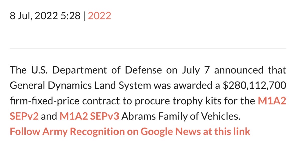 My point is simple. SEP v2 has been fielded extensively with Trophy APS. SEP v3 is an incremental upgrade of the same Abrams platform, with increased power generation and more advanced computing power.