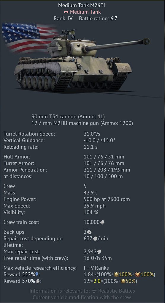 The vehicle is a veteran workhorse that sadly is purchasable only a few times a year, and is not to be confused with the T26E1-1 or M26A1. This vehicle shares many of the same features, and deficiencies of the standard M26 Pershing. It differs in that it is a slightly heavier vehicle due to the longer 90mm T54 canon, and has access to a coaxially mounted .50 Cal heavy machine gun, instead of the 7.62. The M26E1 weighs 42.9 tons, while the standard M26 weighs 41.6 tons. Both vehicles have the same engine of 500HP at 2600RPM. In Realistic and Arcade battles both tanks sit at a Battlerating of 6.7, with the M26E1 being at 6.3 while the standard M26 remains at the stated Battlerating in Simulator matches.