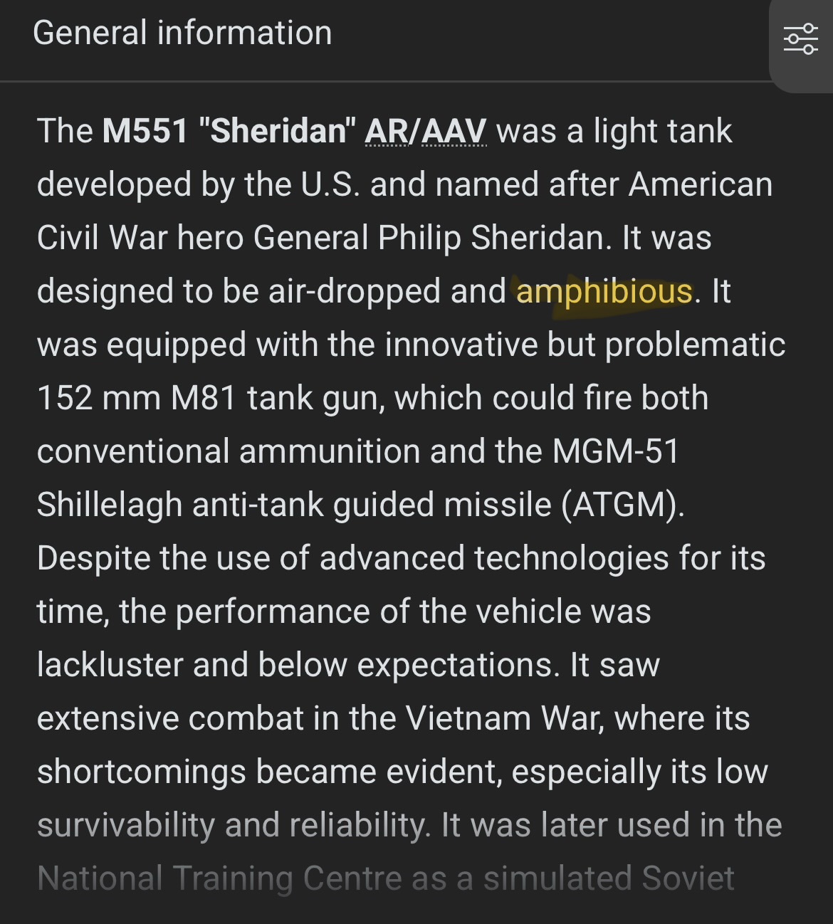 The Sheridan as noted in the description in the War Thunder Wiki and in the Web should be able to swim but it currently isn‘t.