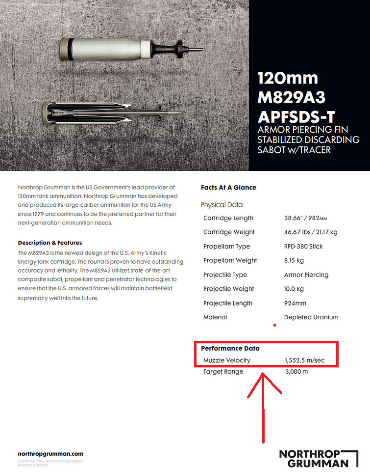 Unfortunately I couldn’t find the M829A2s datasheet that quickly so I used KE-W A2’s which is just a Tungsten version of M829A2, as you can see, the velocity is much higher.
