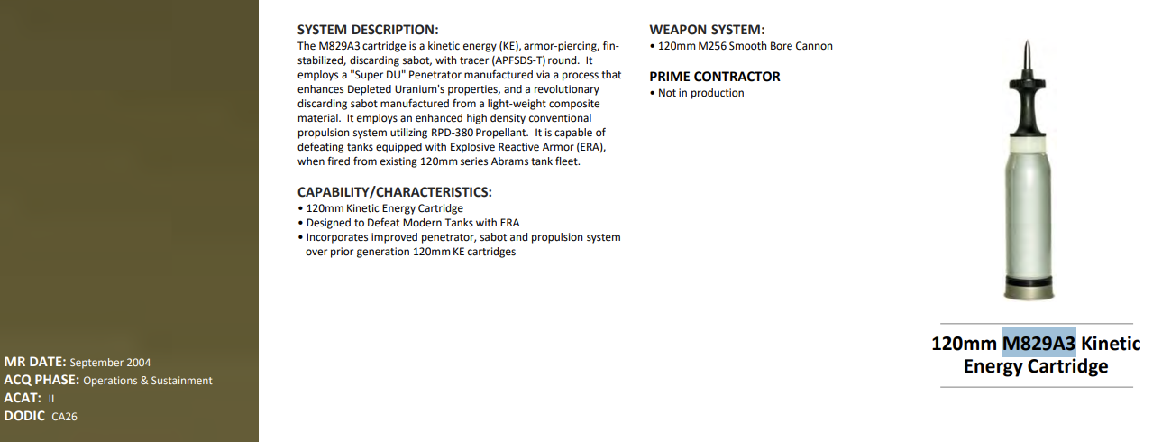 bonus points: a projectile with a long’ish ‘sacrificial’ tip that’s meant to make a hole in the plates and leave the penetrator intact (all 3 also have it afaik, at least M829A4 and DM83 for sure do).