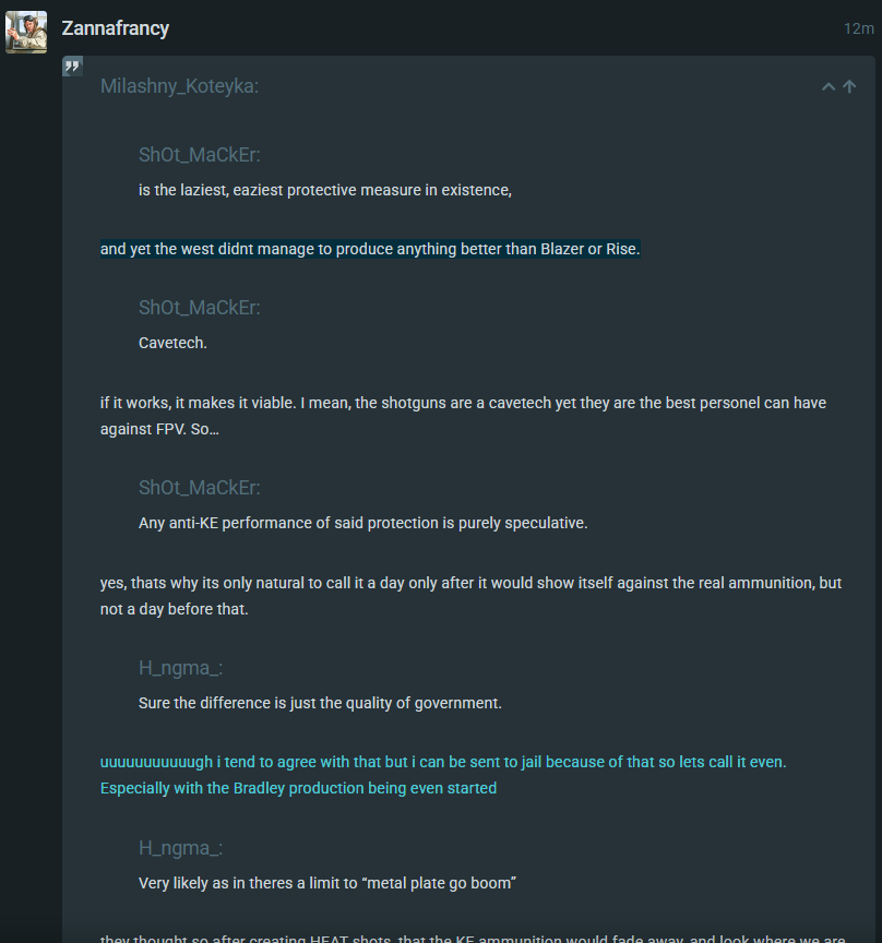 Relikt, nizh and pretty much every other KE focused era becomes pretty much useless against kinetics on a side and top profile, this is on top of the fairly understood counter mechanisms, at the absolute least every modern western armor package that I saw some protection data for offers complete protection against 25mm apfsds and that’s just what is made public through stanag, this is whilst offering much superior defenses against chemical munitions, especially when taking tandem era like Arat 2 into account, now we have no real knowledge on the true capabilities of western armor packages, but make no mistake they aren’t big heavy and expensive for fun.