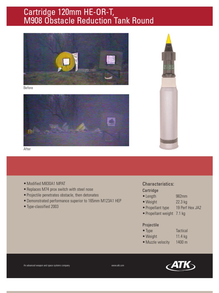 This cartridge is a high explosive, obstacle reduction, tactical service round with tracer. The M908 is used in the 120mm, smooth bore M256 cannon.