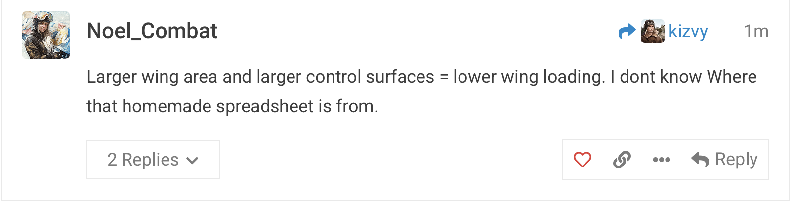 Larger wing area and larger control surfaces = lower wing loading. I dont know Where that homemade spreadsheet is from.