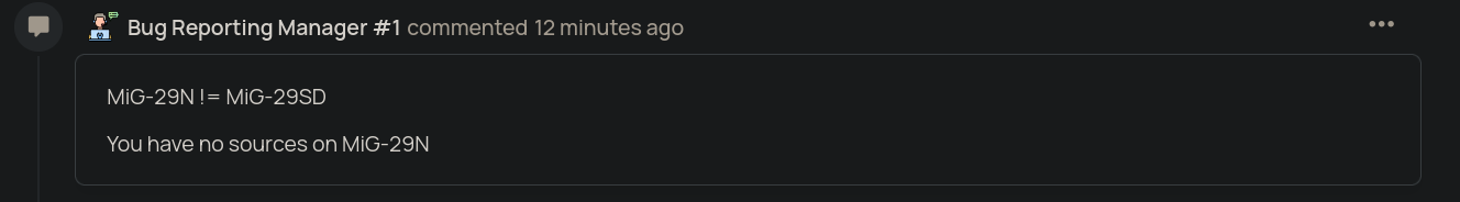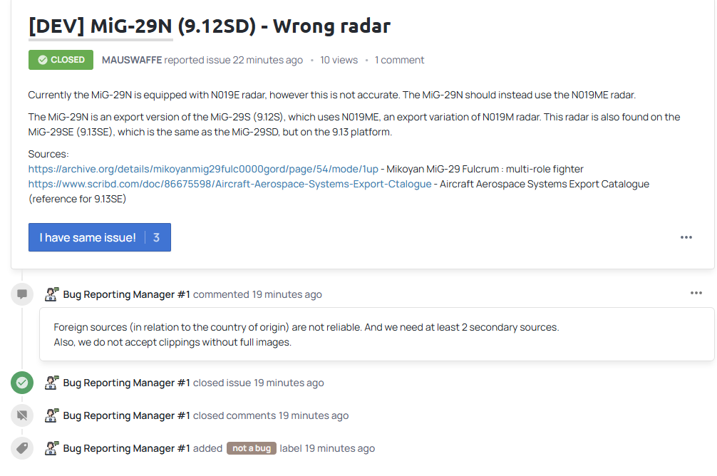 These MiG-29N bug reports were closed as “MiG-29N isn’t MiG-29SD” despite both a source in these reports as well as the game itself saying the MiG-29N is a 9.12SD.