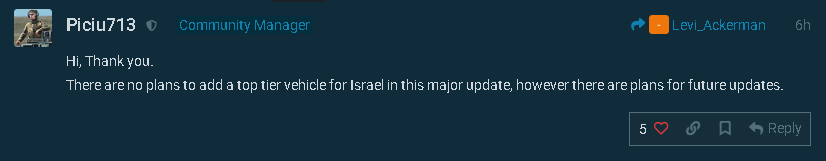 9/10 nations got its top tiers with AESA radars, some of them its second one but there is literally none for israel, it seems that the promise of AESA for all nations for the end of the year from BVVD ended in a trash bin with this statements. @Smin1080p_WT what a huge direspect we were expecting to have our new toy for air as a gift for christmas like the rest of the people that plays the rest of the 9 nations that got its new shiny toys most users of the Israeli server feels completely displaced by the latest statements made yesterday and today, its really sad to see something like this happening at this stage of the year.