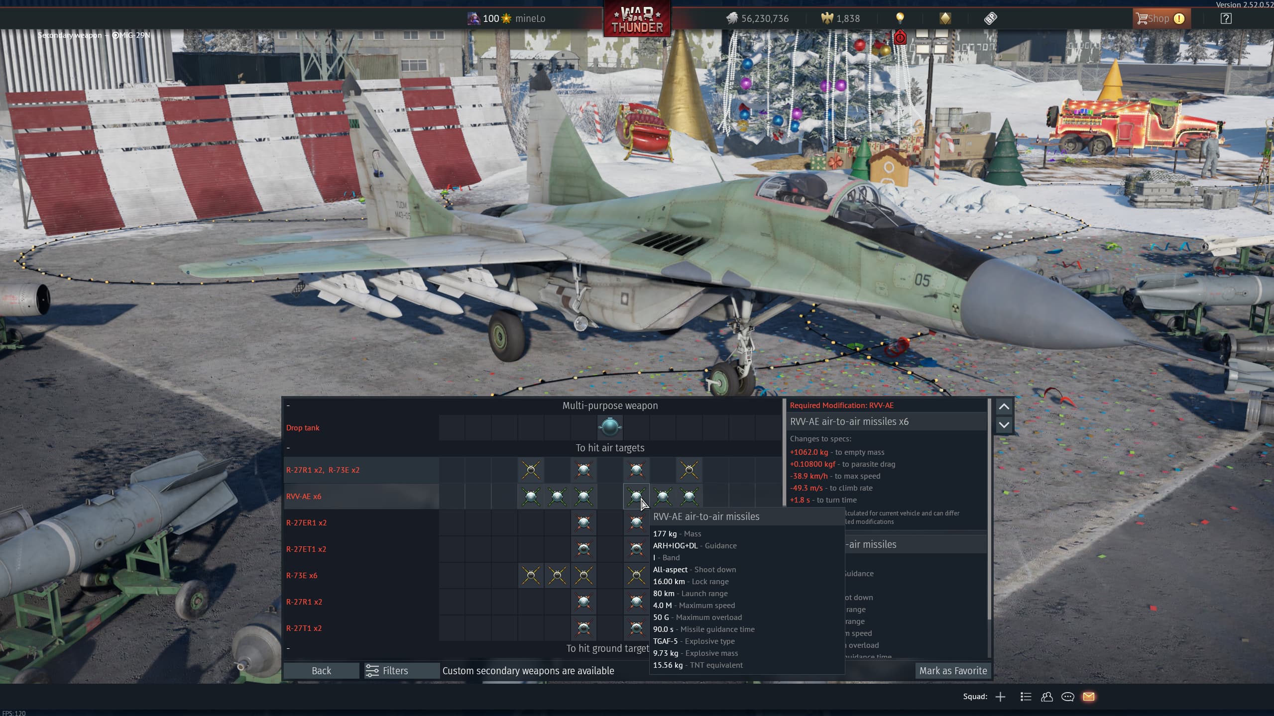 It could fire R-77 from factory (being a Mig-29SD) however malaysia never ordered any (so once again they get a fictional missile)
