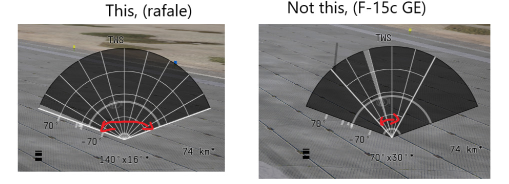 exactly, problem is we don’t know how wide the scan area of the radars itself is, I don’t really need the 180-200 scan of the EFT’s with the Gimbal i just want a radar that scans the whole area that I have the right now, like the Rafale tws that scans the whole avilable area for the radar.