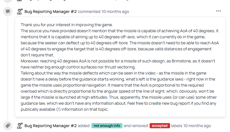 Regarding open reports, so long as the matter is still open, that means it has not yet been rejected by the devs. Usually this is down to 2 main reasons: 1) The source material is trying to be confirmed (assuming it conflicts with what is already known and understood) or 2) it is scheduled for a wider rework of the missile(s) in terms of physics, performance or a general updating of missiles across the board (such as the above mentioned drag rework for context).