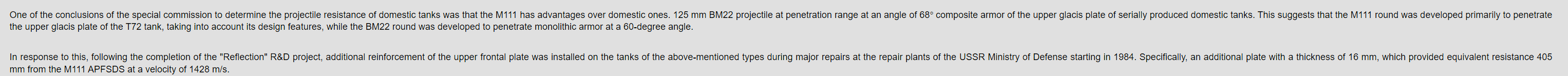 In any case, even if this data is from the 3BM22, for example, the 330mm of protection (as in the game) for the T-72A is fully supported by this data. (If 305mm were for the long APFSDS, the T-72A should have higher protection than 330mm, since the additional 10mm of steel and the optimized thickness of the front and rear plates provide a significant increase in resistance.)