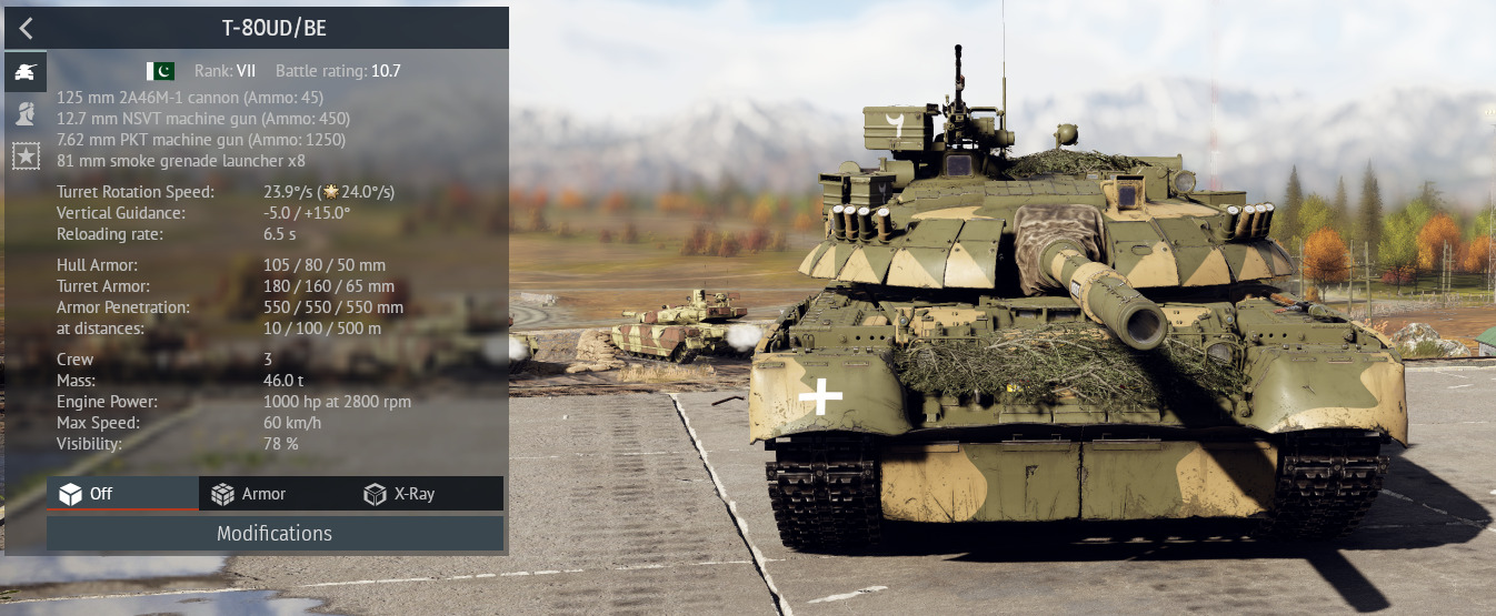The T-80UD 478BE is the final evolution of Ukraino - Pakistani T-80UD series of vehicles and the bridge between the T-80UD and the T-84. It features the same welded turret design as the 478BK whilst sharing all other similar specifications as the 478DU1.