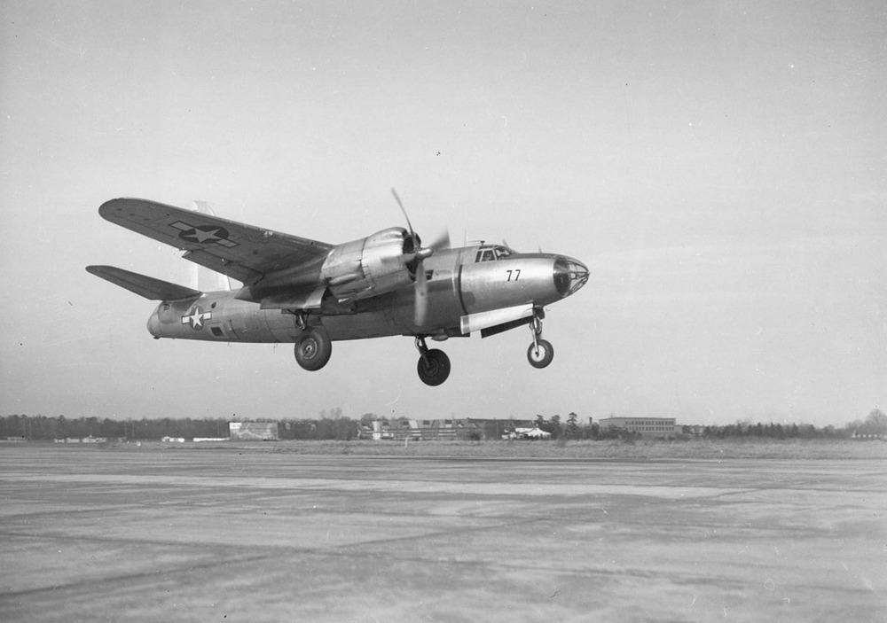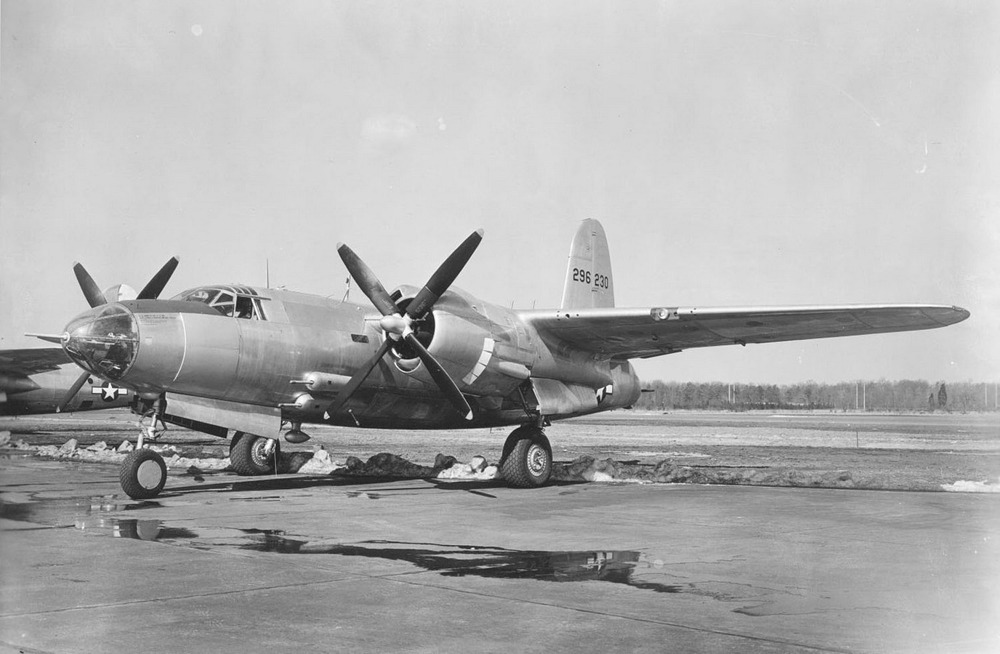 By 1942, the B-26B/C Marauders were well established in production and combat, but Martin and the USAAF continued to pursue refinements to the design. In the fall of 1943, Martin proposed altering the wing’s angle of incidence to improve the type’s takeoff and landing performance, an area where the Marauder had earned a mixed reputation, such as the “Widow Killer.” The incidence was increased by 3.5 degrees, raising it to 7 degrees total. This small change granted several benefits: greater ground clearance for the propellers, reduced takeoff distance, lower stall and landing speeds, and improved lift. In practical terms, the modification shortened the takeoff run of a fully loaded B-26 by about 100 yards, reduced takeoff speed to 110 mph, and cut landing distance by one-quarter. However, the higher incidence gave the B-26F a tail-up attitude in level flight, slightly increasing drag and reducing top speed to 277 mph.