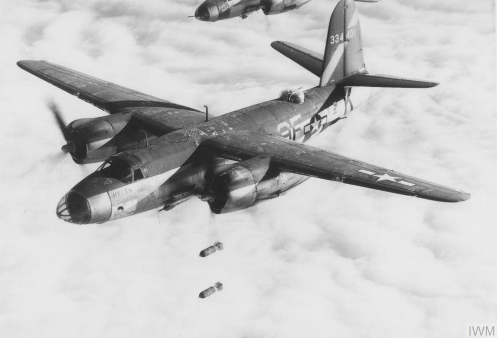The first B-26F-1-MA rolled out in February 1944, and 100 were completed under USAAF contract, all delivered in natural metal finish. Some were dispatched to the 12th Air Force in the Mediterranean, while the majority reinforced the 9th Air Force in Britain in May 1944. They entered combat over occupied Europe in June, supporting the Normandy landings and subsequent operations. Many were later field-camouflaged in olive drab with gray markings and yellow serials.