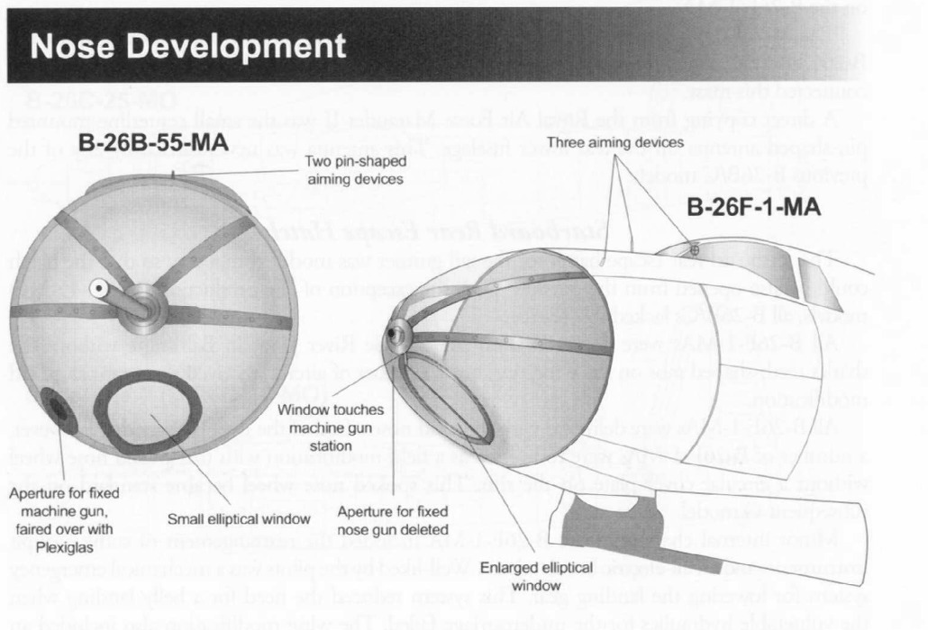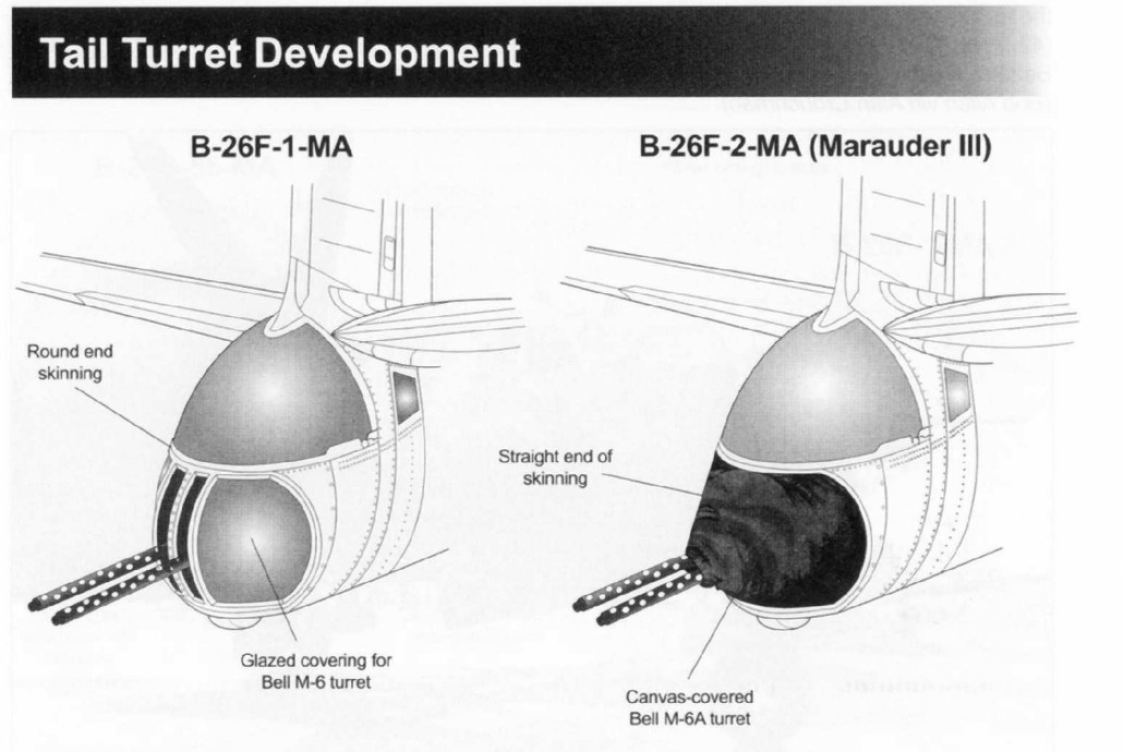 Production continued with the B-26F-2 and F-6, 200 aircraft destined for the RAF and South African Air Force, where they were designated Marauder III. These differed slightly from the USAAF B-26F-1, mainly in equipment: the Bell M-6 tail turret was replaced with the M-6A (with a canvas gun shroud), flexibly mounted guns were given optical sights, the Sperry T-1 bombsight was replaced with the M-series, and provision was made for British-style bomb shackles and fuses. Radio equipment was also adapted to RAF/SAAF standards.