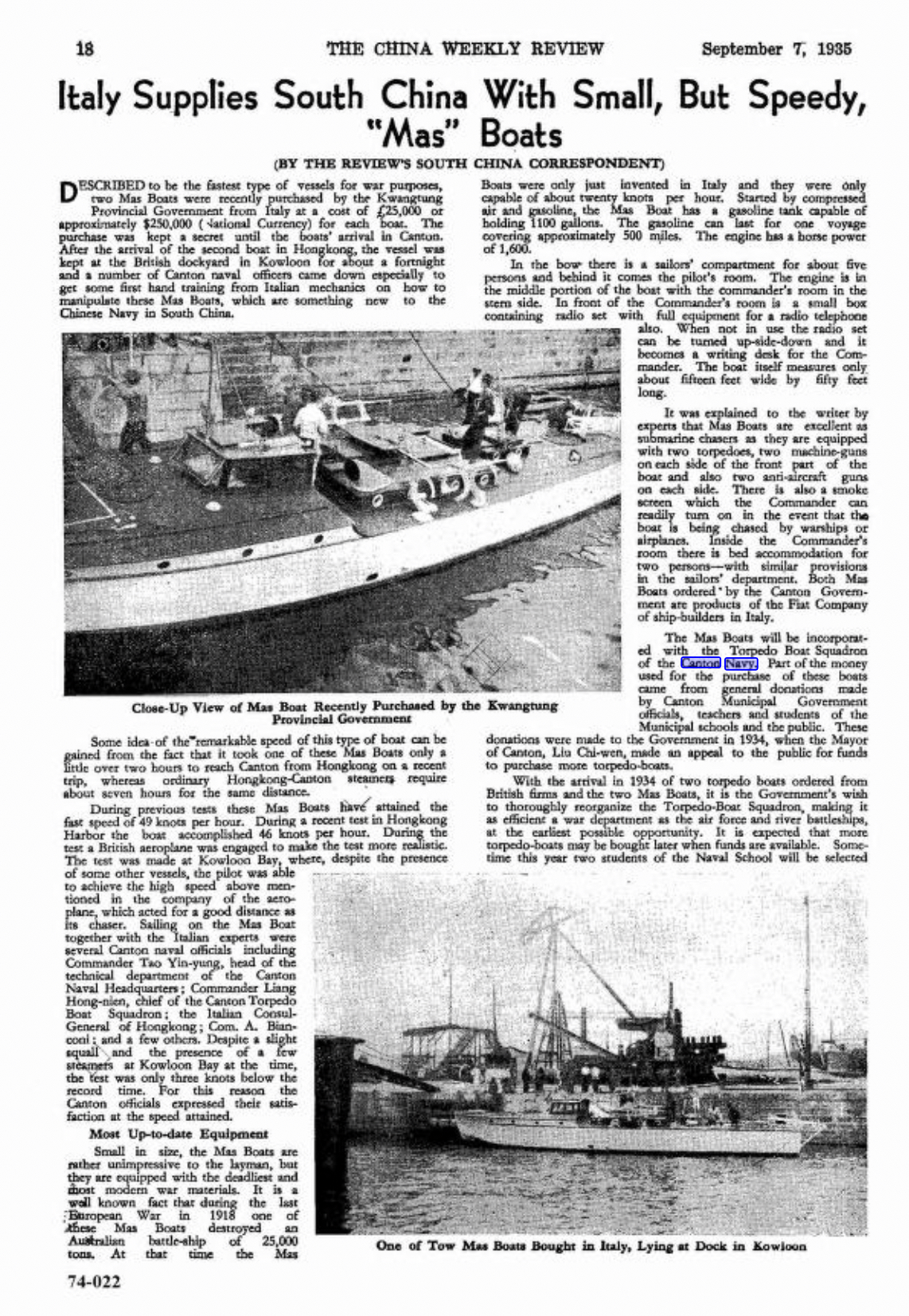 In June 1936 the torpedo speedboats of the Guangdong navy were incited to defect to the nationalists. However only 2 actually made it (CMB No. 1 and MAS No. 4 ) as the captains were on leave that day. CMB No.2’s captain was watching a movie at the theatre and could not be contacted and MAS No.3’s captain Lin Changpeng’s bus broke down on the way back to base. The next month Guangdong and Guangxi navy’s were taken over by the nationalists and the 4 torpedo boats of the Guangdong navy were reunited once more.