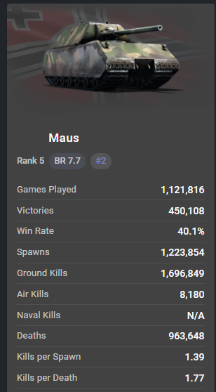 Maus has been at 7.7 for a long while now, all the while many vehicles above it moved up in BR, allowing it to be less impacted by uptiers. As it is right now, it should be going up to 8.0 as it has way too good stats for a vehicle that’s played so much and that’s also available to the general population.