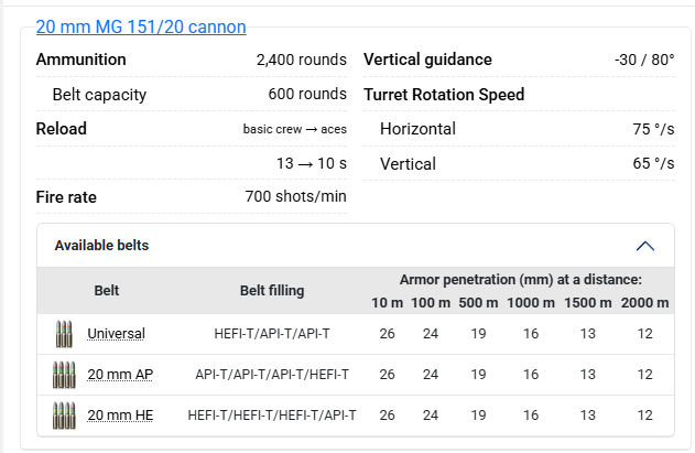 For MG151/20, the AP-I penetration loss is too high when the distance reaches to 500m, with only 14mm penetration, compared to the similar cannon HO5, which has the same penetration at 10m and the same weight. HO-5’s AP is 17mm/500m. And I’m also not sure why Gaijin add another MG151/20 AP for boat, it shows much better AP rounds with 19mm/500m penetration, is MG151/20 rounds nerfed too much?