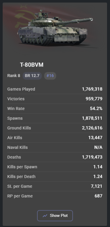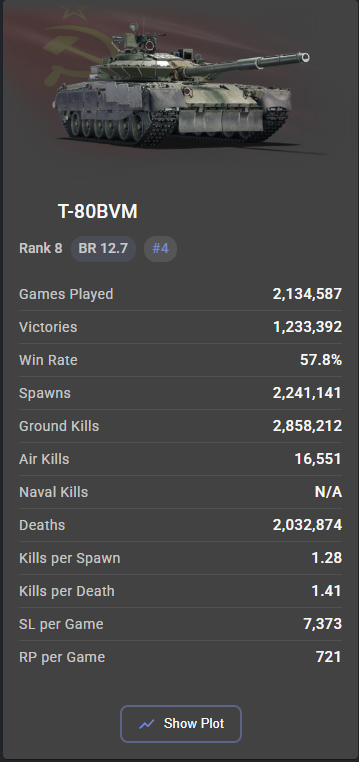 Note that the T-80BVM has 4 times the games of the Mi-28NM, yet it still maintains a 63% winrate and a 2-3KD from October. The T-80BVM is not the strongest tank in the game.