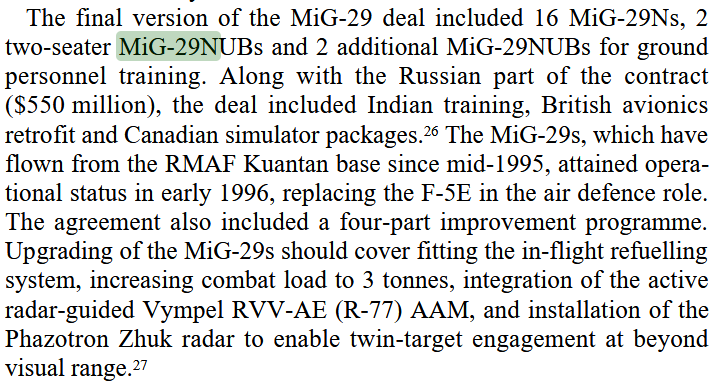 The MiG-29N/SD (9-12SD) that Malaysia could be a USSR/British (the Commonwealth) squadron aircraft on 13.0/13.3. It equipped with N019ME Topaz radar that accessed the R-77/RVV-AE ARH AAM and could engage 2 targets simultaneously.