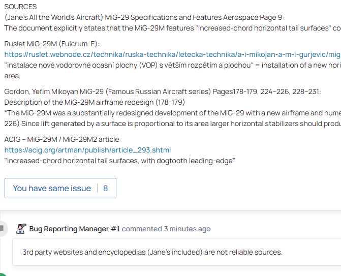 I understand. Imagine this situation just for an example, setting the report aside. You know that some values of the FM are wrong, but you can’t make a report because you have no way to justify it according to Gaijin’s requirements. What would you do? Would you just let it go, or would you try to fix it to achieve the most realistic MiG-29 flight model possible? The problem is that since you can’t justify it 100% the way Gaijin requires, the report gets rejected, or maybe this time I just made a shitty report, even though they are aware of the issue, even if you provide related information.