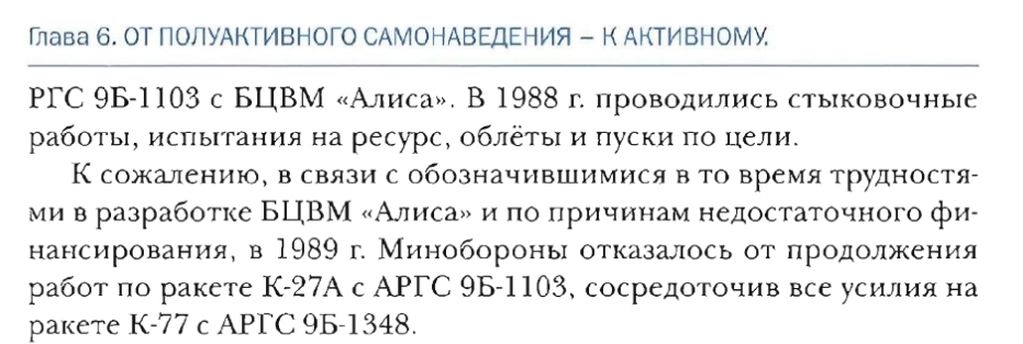 для УР «воздух воздух», определен оптимальный диапазон частот и тип зондирующего сигнала с квазинепрерывным излучением, выбран моноимпульсный метод пеленгации цели, разработаны макеты основных устройств АРГС, вт.ч. волноводнощелевая антенная решетка, а также миниатюрная БЦВМ массой всего 1 кг. Созданный научно-технический задел позволил в 1982 г. приступить к ОКР по созданию двух активных радиолокационных головок самонаведения: 9Б-1103 (АРГС-27) для молификации раксты Р-27Р (ЭР) с АРГС (К-27А) и 9Б-1348 для новой ракеты