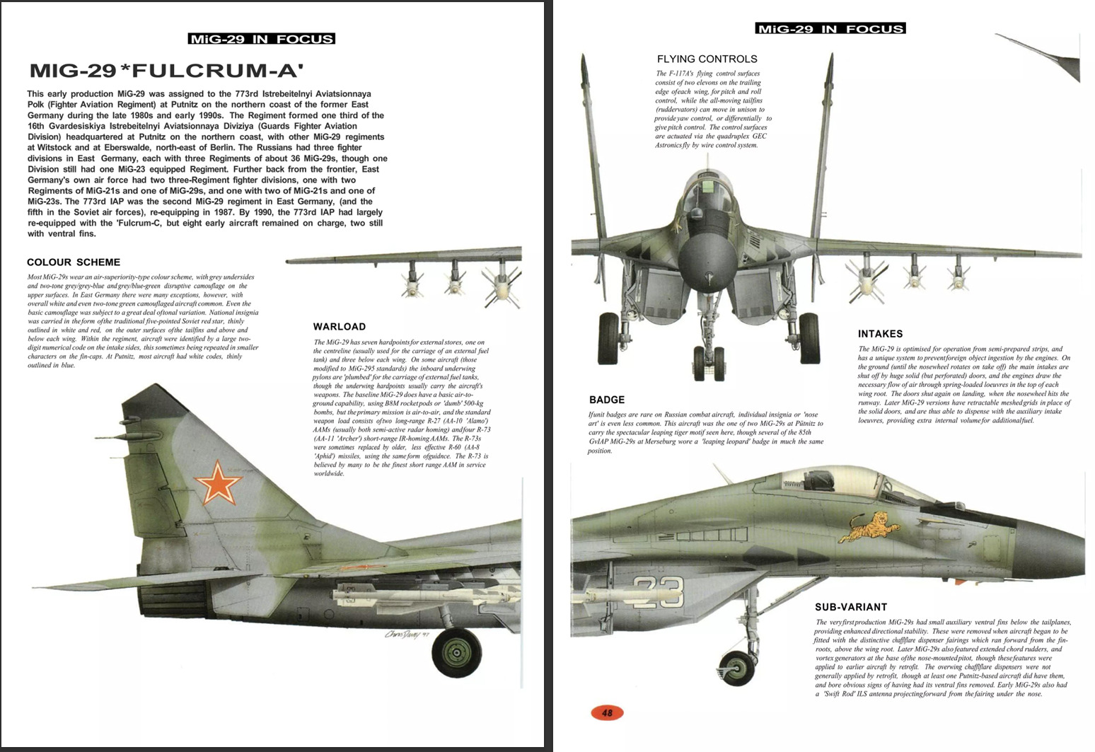 This early production MiG-29 was assigned to the 773rd Istrebeitelnyi Aviatsionnaya Polk (Fighter Aviation Regiment) at Putnitz on the northern coast of the former East Germany during the late 1980s and early 1990s. The Regiment formed one third of the 16th Gvardesiskiya Istrebeitelnyi Aviatsionnaya Diviziya (Guards Fighter Aviation Division) headquartered at Putnitz on the northern coast, with other MiG-29 regiments at Witstock and at Eberswalde, north-east of Berlin. The Russians had three fighter divisions in East Germany, each with three Regiments of about 36 MiG-29s, though one Division still had one MiG-23 equipped Regiment. Further back from the frontier, East Germany’s own air force had two three-Regiment fighter divisions, one with two Regiments of MiG-21s and one of MiG-29s, and one with two of MiG-21s and one of MiG-23s. The 773rd IAP was the second MiG-29 regiment in East Germany, (and the fifth in the Soviet air forces), re-equipping in 1987. By 1990, the 773rd IAP had largely re-equipped with the 'Fulcrum-C, but eight early aircraft remained on charge, two still with ventral fins.