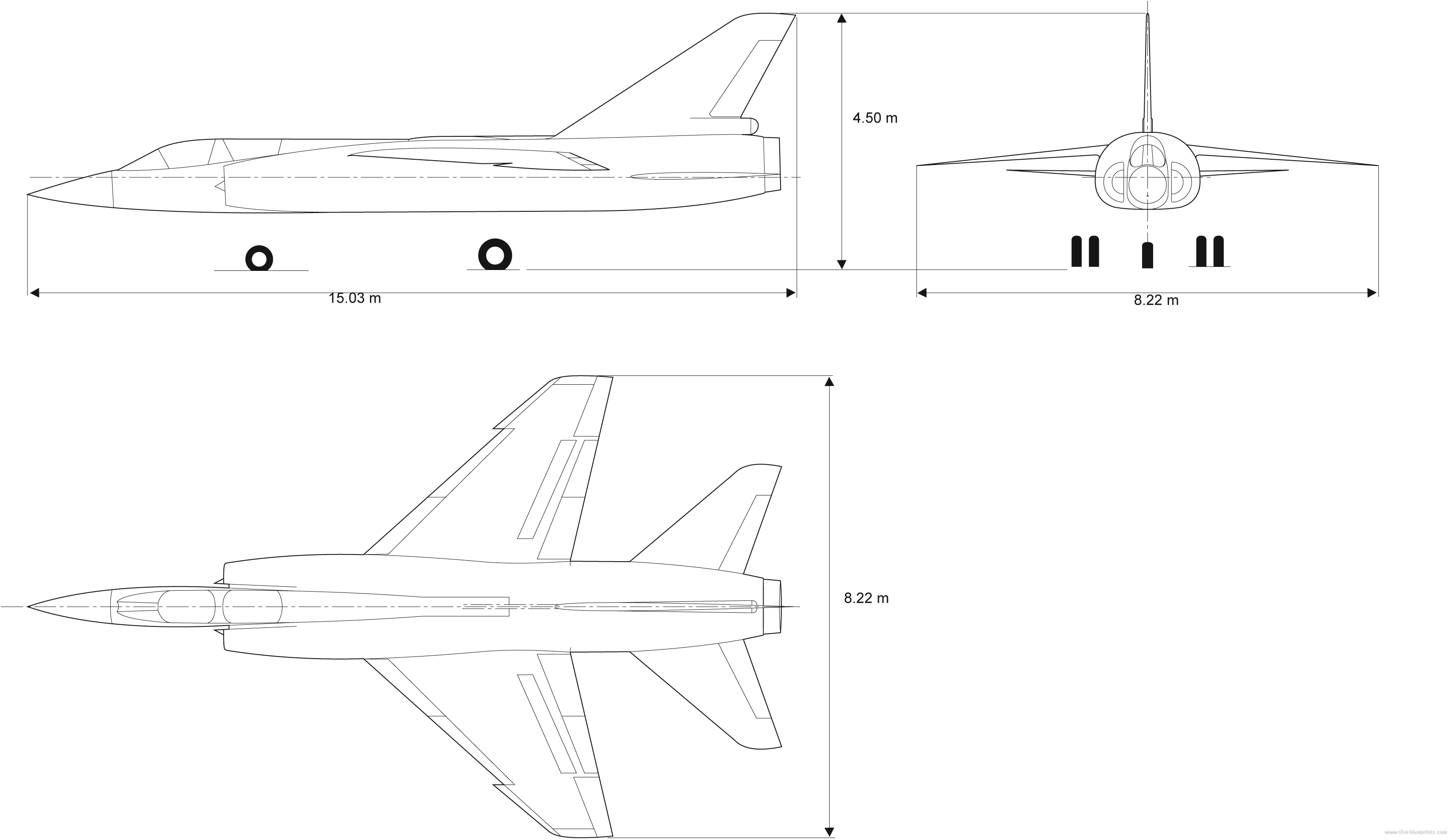 The aircraft is powered by an 8,600 kgp Pratt & Whitney TF-306 engine, allowing it to reach a maximum speed of over Mach 2 and climb to an altitude of 20,000 m.