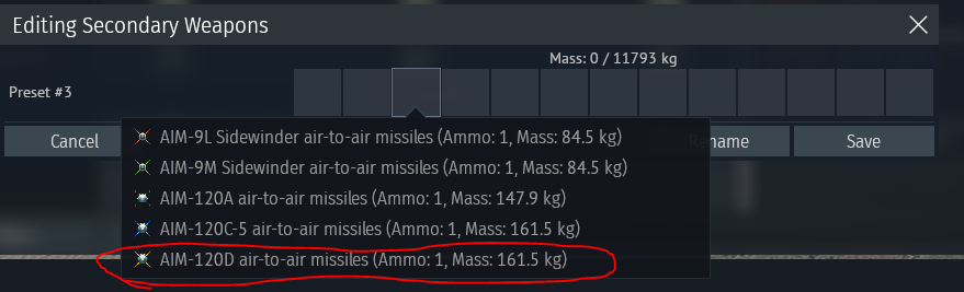 Now with the introduction of the new AIM-120D missile, that as of now is functionaly an AIM-120C5 with a longer battery life many jets a missing the option to bring the AIM-120A/B missiles