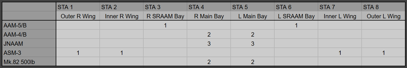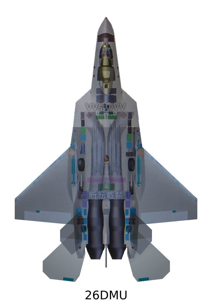 The 26DMU had 4 internal weapons bays, 2 primary ones, holding up to 6x MRMs, and two secondary ones, each holding one IR missile, presumably AAM-5/B (/Upcoming C in theory, if it was actually finished). Additionally the plane features one internally one of the same JM61A2s as used on the F-2.