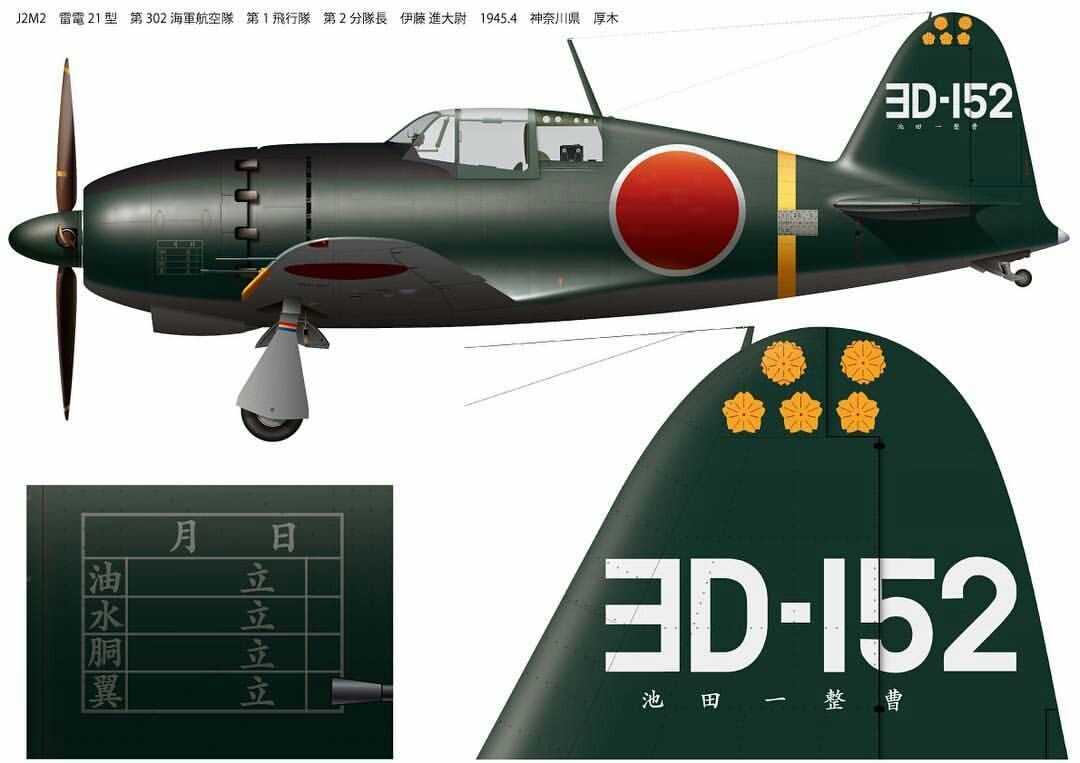 At the beginning of 1944, the Japanese knew that the Americans were preparing for bombing raids from China on Japan using the new B-29 bombers. The Japanese Navy command realized that the new American bombers would pose a significant problem in intercepting them, based on experiences from battles with the B-17 and B-24 bombers. The Japanese Navy had introduced new J2M2 interceptors into production, but they had similar firepower to the A6M3 fighters, which struggled in combat against bombers. The Navy command decided to address the issue of insufficient firepower in two ways. The first was to use four Type 99 cannons instead of two (thus creating the J2M3). The second solution was to install Type 2 cannons in the wings instead of Type 99 cannons. The Type 2 30mm cannons were introduced into limited production in mid-1943. The Type 2 cannons were tested in 1943 on Mitsubishi A6M3 fighters. Earlier it was believed that the A6M fighters had too delicate a construction to withstand prolonged use of the Type 2 guns; however, the Mitsubishi J2M2 had a stronger structure. The Type 2 cannon had confirmed effectiveness in destroying large aerial targets, so that was a big plus. The modification of the J2M2 aircraft itself was not difficult, and the first J2M2 aircraft with Type 2 cannons went for testing in May 1944. The tests showed that the aircraft met the requirements, and the Japanese modified several J2M2 fighters that went to the 302nd Naval Aviation Squadron. The 302nd Naval Aviation Squadron was a Japanese aviation squadron responsible for the defense of Tokyo, which later became known for having a large number of intercepting fighters arranged in a Schräge Musik configuration. The first confirmed combat use of the J2M2 with Type 2 cannons occurred on December 3, 1944, when Mikami Hiso from the 302nd Squadron attacked a B-29 bomber. The attack on the B-29 took place from below and in front of the B-29, resulting in the bomber disintegrating upon impact. However, the J2M2 Mikami Hiso was hit in the engine and made an emergency landing in Tokyo Bay. The next certain use of J2M2 fighters with Type 2 cannons was on May 29, 1945. At that time, in an attempt to intercept 500 B-29 bombers escorted by 100 P-51s from the 302nd Squadron, 5 A6M fighters and 3 J2M fighters, which included a J2M2 with Type 2 cannons piloted by Shoji Kuroda, took off. In the Sagami Bay area, the A6M fighters, which had overtaken the J2M fighters, began to engage the escorting P-51 fighters. Three J2M fighters moved to assist their comrades, and when Shiji Kuroda tried to attack one of the P-51 fighters, he discovered that the Type 2 cannons on his fighter had jammed. This caused his J2M2 with Type 2 cannons to be shot down, and Shiji escaped by parachute. Likely until the end of the war, the 302nd Squadron used J2M2 fighters with Type 2 cannons, almost all of which were presumably lost in combat. No photos of J2M2 with Type 2 plots have been preserved.