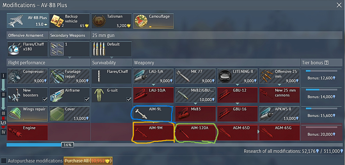 Even after unlocking the AIM-9L modification, the two additional AIM-9L missiles conflict with the hardpoint positions of the stock AMRAAM missiles provided by default. In practice, there is no meaningful advantage or incentive to choose AIM-9Ls over AMRAAMs in the current in-game environment.