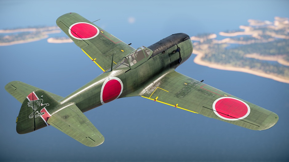 Ein Kennzeichen der 1. Rensei Hikotai (1. Kampfflugzeug-Ausbildungseinheit) der Kaiserlich Japanischen Heeresluftstreitkräfte. Die Einheit, die oft fälschlicherweise als 520. Provisorisches Luftverteidigungsgeschwader bezeichnet wird, wurde am 22. Juli 1944 gegründet. Nach Abschluss ihrer Trainingsphase unterstützte sie die 10. Hikoshidan (10. Luftdivision) bei der Abwehr von Angriffen durch B-29-Bomber. Das Zeichen wurde offenbar erstmals vom Illustrator Rikyu Watanabe dargestellt, nachdem er gemeinsam mit dem ehemaligen Piloten der 1. Rensei Hikotai, Naito Noboru, Recherchen zu dieser Einheit durchgeführt hatte. Es ist unklar, ob dieses Zeichen auf Erinnerungen basiert oder direkt aus privaten Fotos übertragen wurde, obwohl es einem Corporal Kuroiwa zugeschrieben wird. Varianten des Abzeichens tauchten später auf den Flugzeugrümpfen von Spezialeinheiten auf. Dieses Beispiel (sofern es korrekt ist) ist jedoch älter als diese Darstellungen, was darauf hindeutet, dass das Abzeichen möglicherweise falsch zugeordnet wurde oder sogar der Ursprung der späteren Abzeichen ist. Dies ist plausibel, da Piloten der 1. Rensei Hikotai später zu den Einheiten stießen, die dieses Abzeichen nachweislich verwendeten. In dieser Form ist die Platzierung auf dem Heck einer Ki-84 der 1. Rensei Hikotai dargestellt, wobei der rote Verteidigungsstreifen die gesamte Spannweite des Hecks bedeckt.