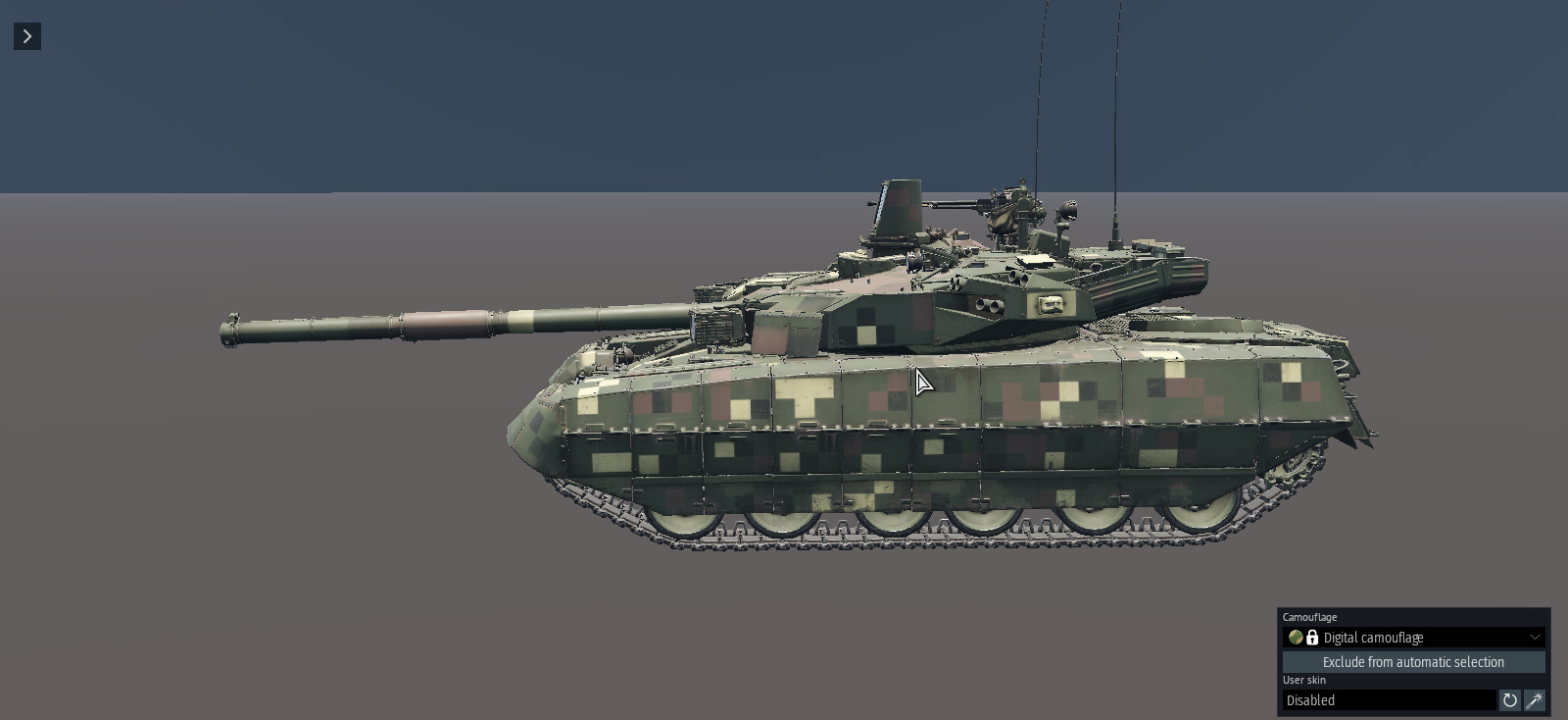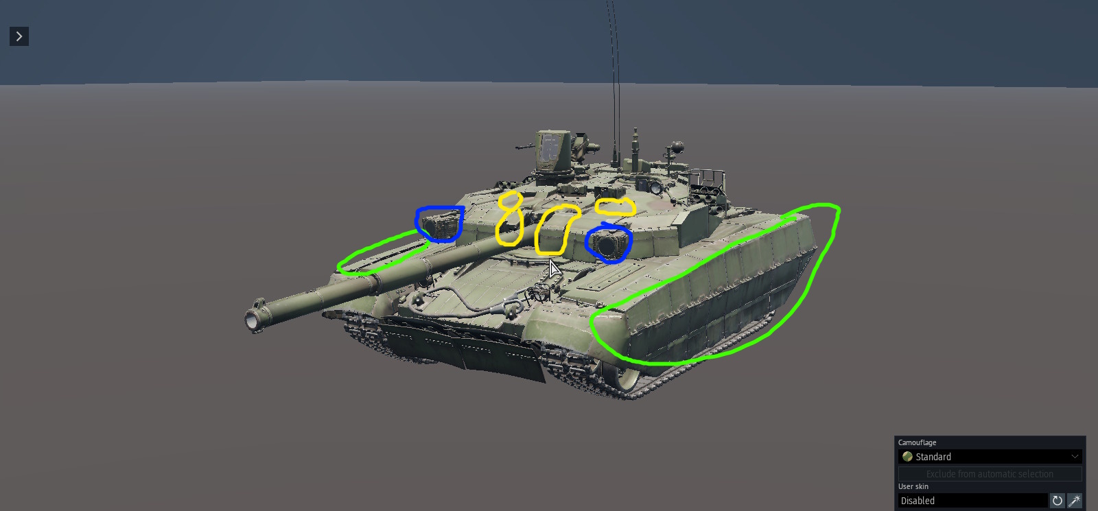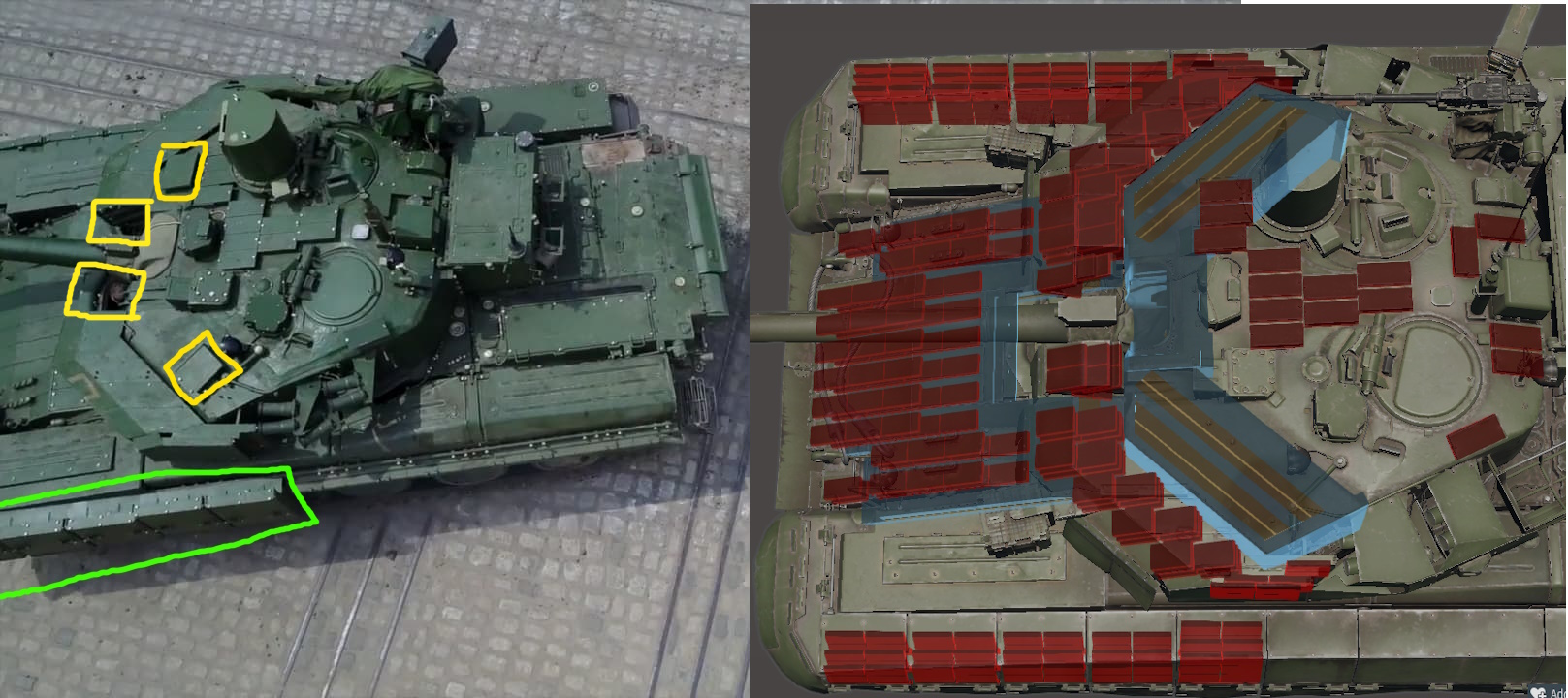 The thick Duplet ERA side skirts that cover the whole length were replaced with lightweight sideskirts that cover only the frontal half of the hull. (likely Nizh, since thinner).