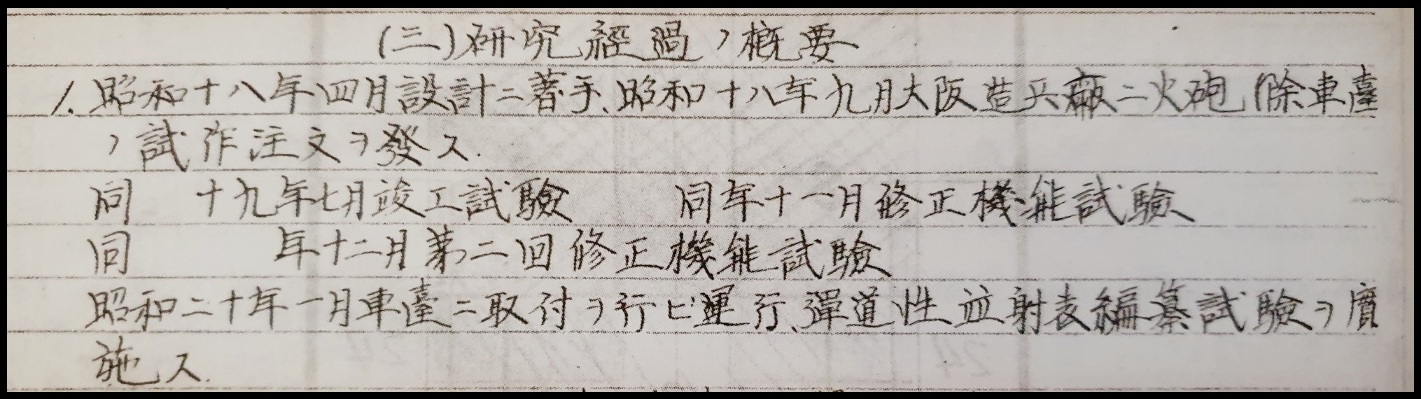 However, the actual research notes state that the gun mounted in December was the 7.5 cm Anti-Tank Gun Model I, with no mention of the Type 3 Tank Gun. Since the project had aimed for a muzzle velocity of 850 m/s from the outset, it is highly unlikely that the Type 3 Tank Gun, with its muzzle velocity of 668 m/s, was ever part of the research. This statement was removed in Takeuchi’s later work,『日本の大砲 (1986)』.